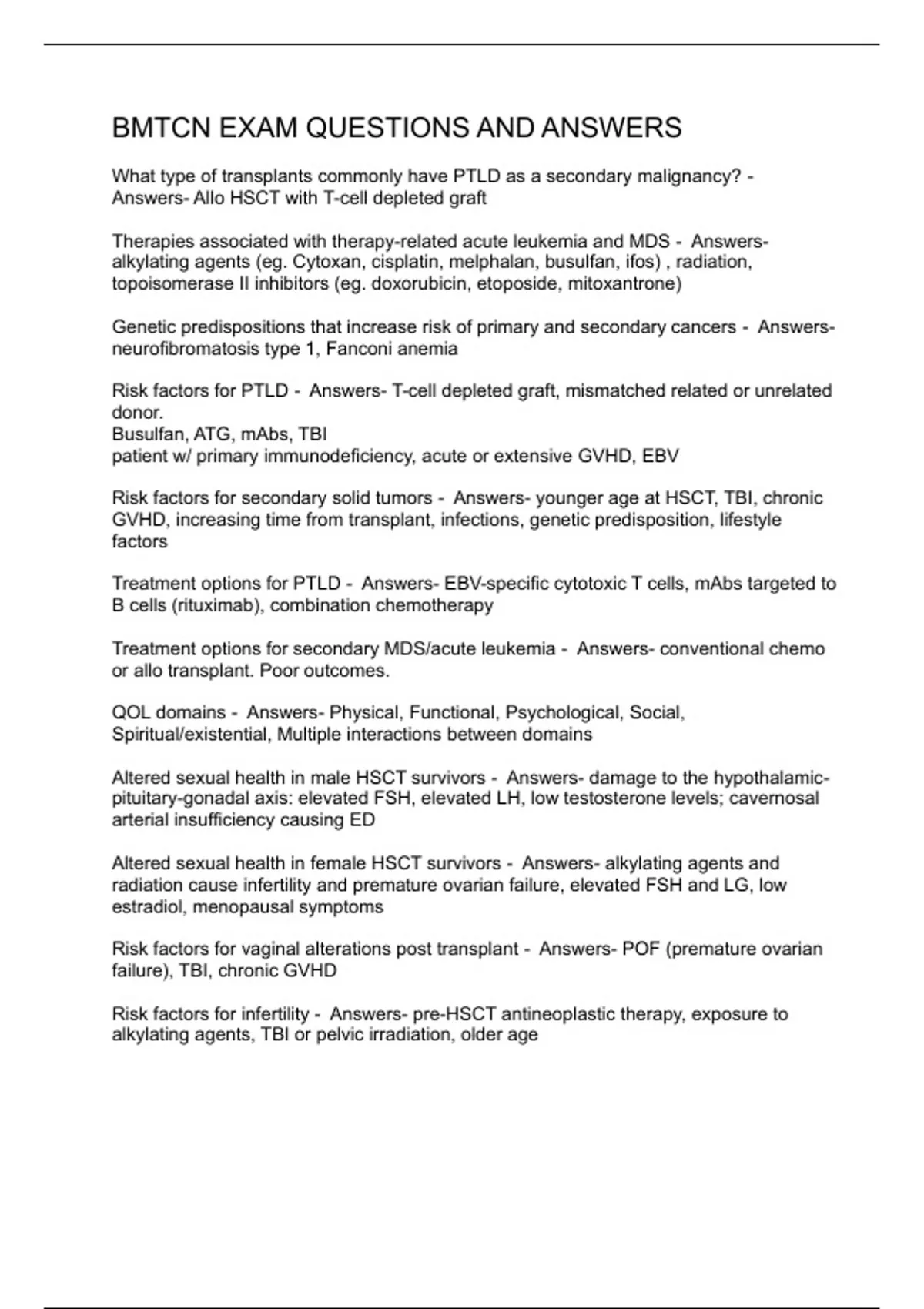 BMTCN EXAM QUESTIONS AND ANSWERS 2 Exam (elaborations) BMTCN EXAM QUESTIONS AND ANSWERS 3 OTHER BMTCN EXAM STUDY GUIDE 4 Exam (elaborations) BMTCN PRACTICE TEST A QUESTIONS & ANSWERS 5 Exam (elaborations) BMTCN PRACTICE TEST QUESTIONS AND ANSWERS 6 Exam (elaborations) BMTCN TEST QUESTIONS AND ANSWERS