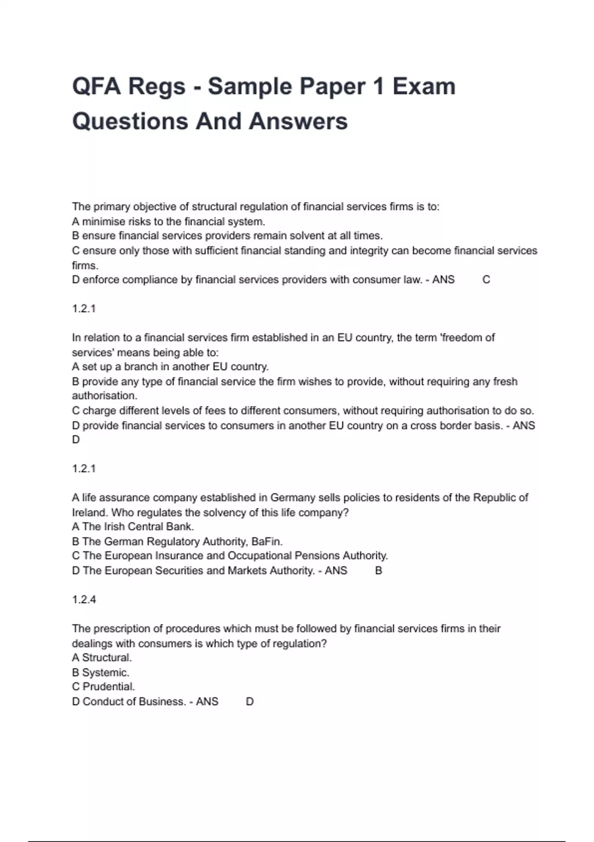 QFA Regs - Sample Paper 1 Exam Questions And Answers