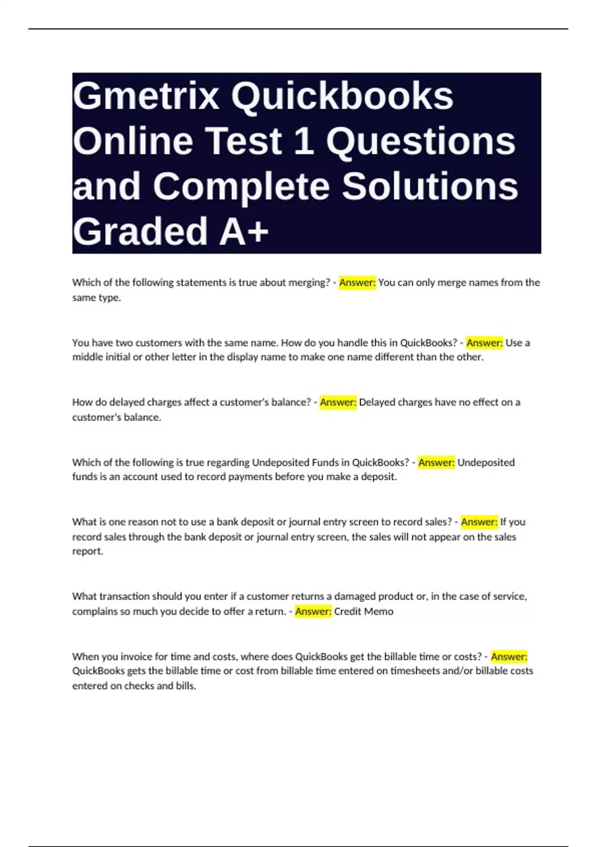 QuickBooks Certification Test Questions and Complete Solutions Graded A Bundle
