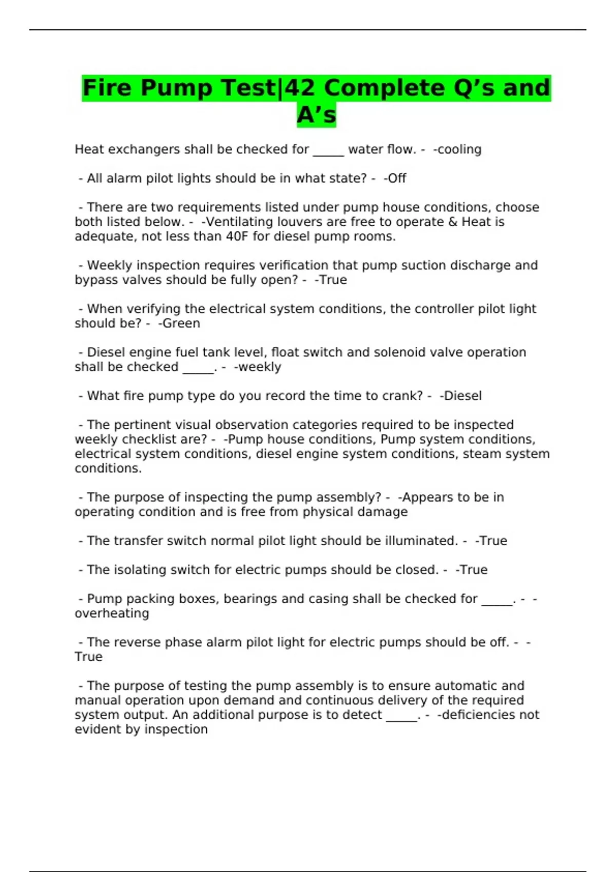 Fire Pump Study Guide Exam Questions and Answers A+ Graded