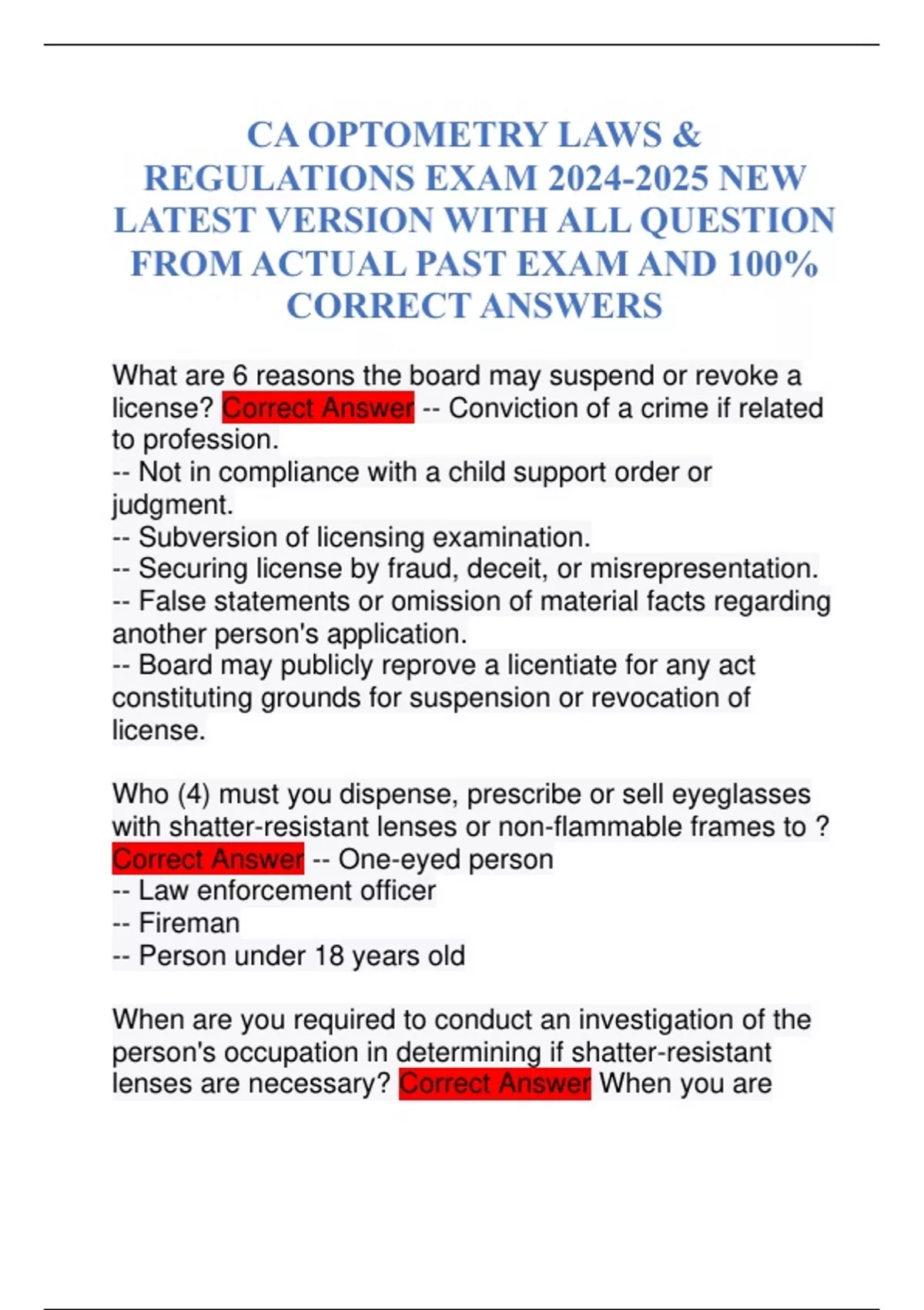 CA OPTOMETRY LAWS & REGULATIONS EXAM NEW LATEST VERSION WITH ALL QUESTION FROM ACTUAL PAST EXAM AND 100% CORRECT ANSWERS