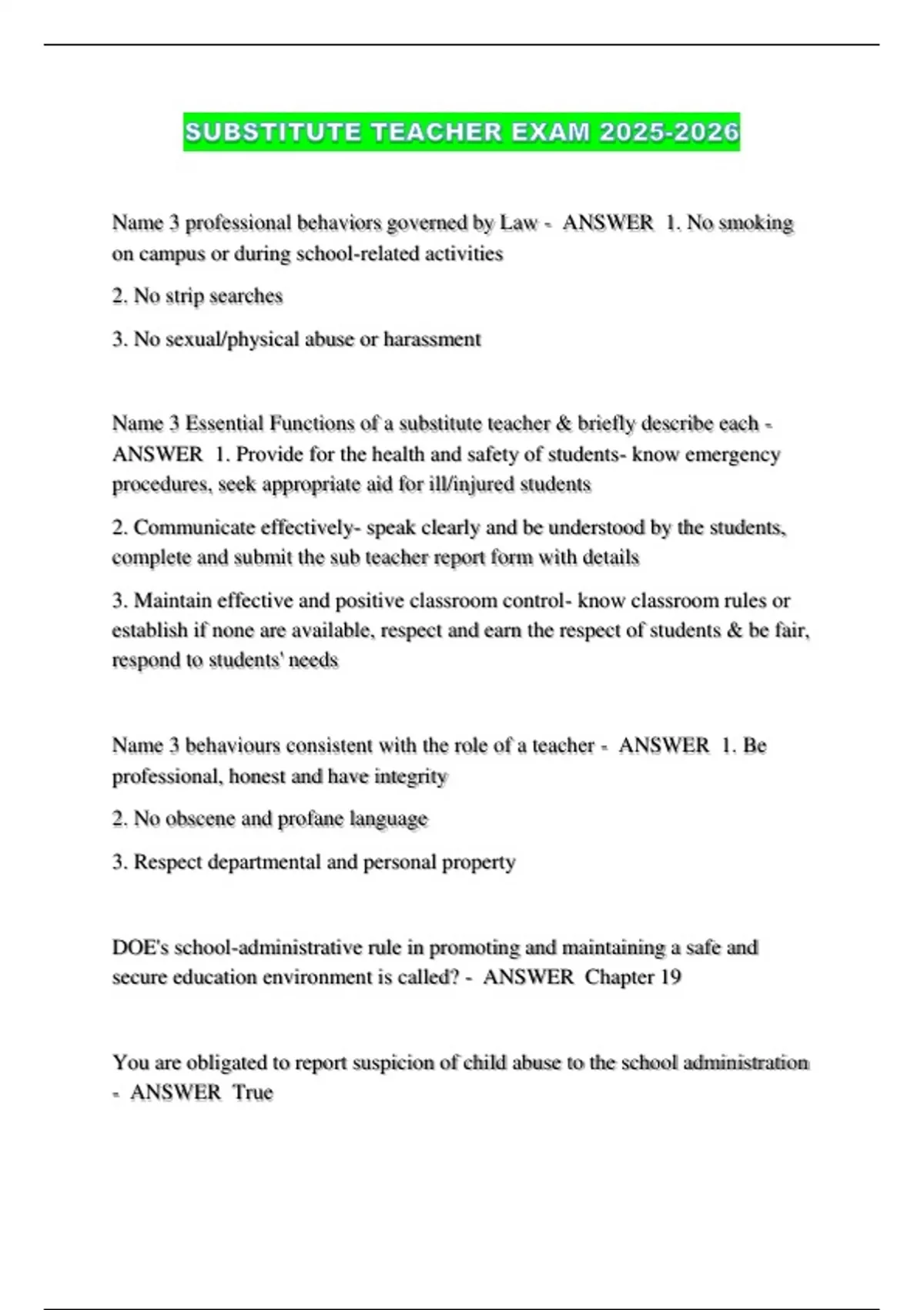 SUBSTITUTE TEACHING MANUAL EXAM STUDY GUIDE