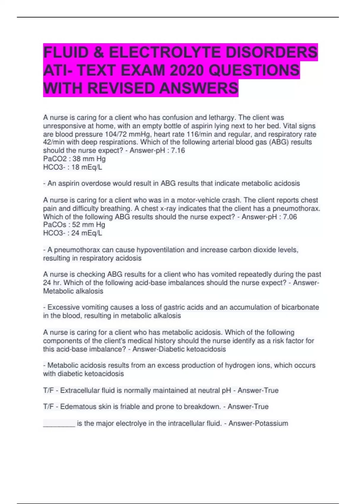 ELECTROLYTE VALUES EXAMINATION QUESTIONS WITH REVISED AND UPDATED ANSWERS 2 Exam (elaborations) ELECTROLYTES VALUE COMBINED SET QUESTIONS WITH CORRECT ANSWERS 3 Exam (elaborations) ELECTROLYTES VALUES EXAM QUESTIONS WITH ALL CORRECT ANSWERS 4 Exam (elaborations) FLUID & ELECTROLYTE DISORDERS ATI- TEXT EXAM 2020 QUESTIONS WITH REVISED ANSWERS