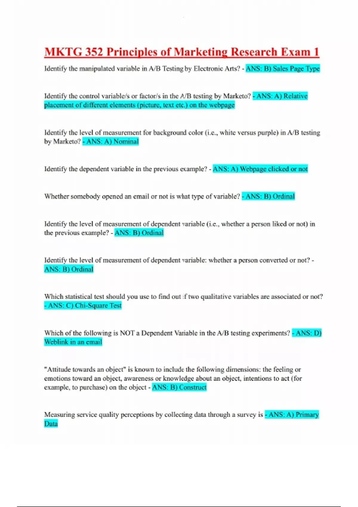 Answered MKTG 352 Principles of Marketing Research Exam Review (Exam 1, 2, 3 and Final Exam)