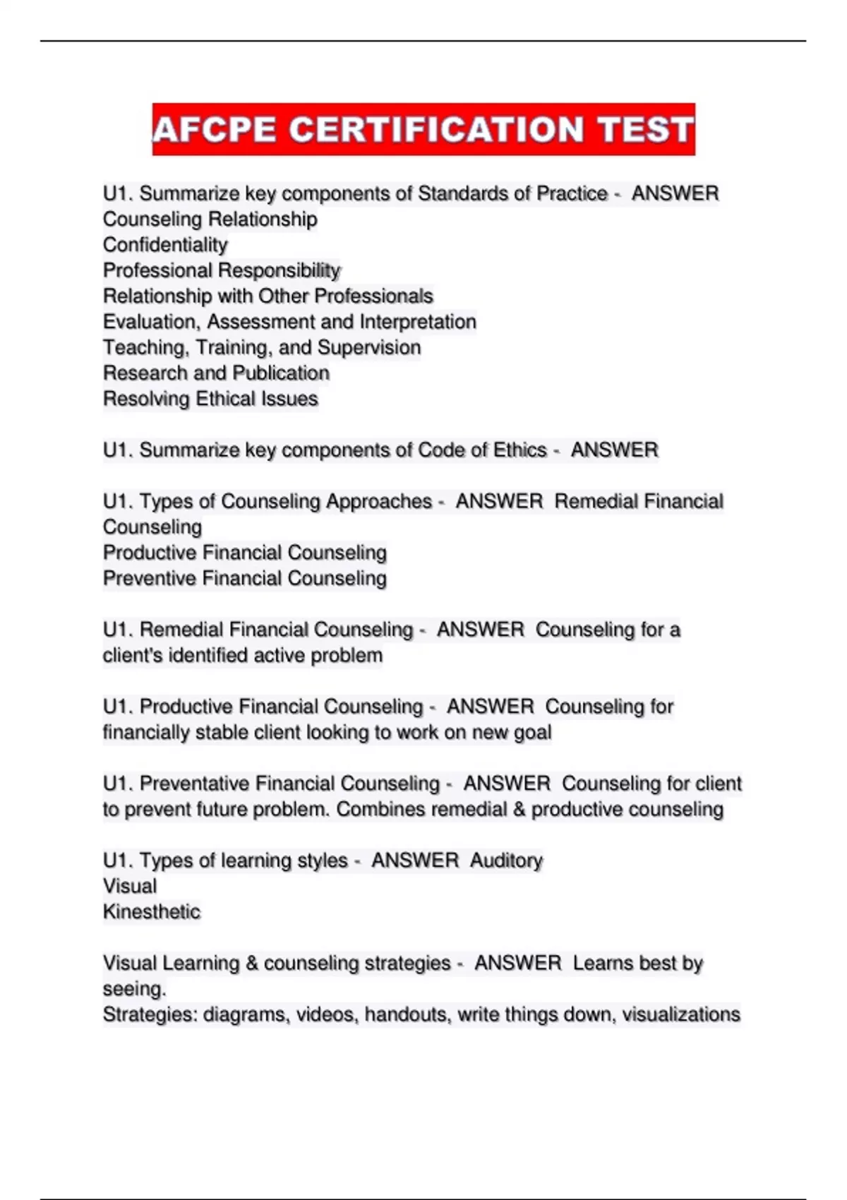 AFCPE UNIT 1-FINANCIAL COUNSELING EXAM QUESTIONS AND ANSWERS