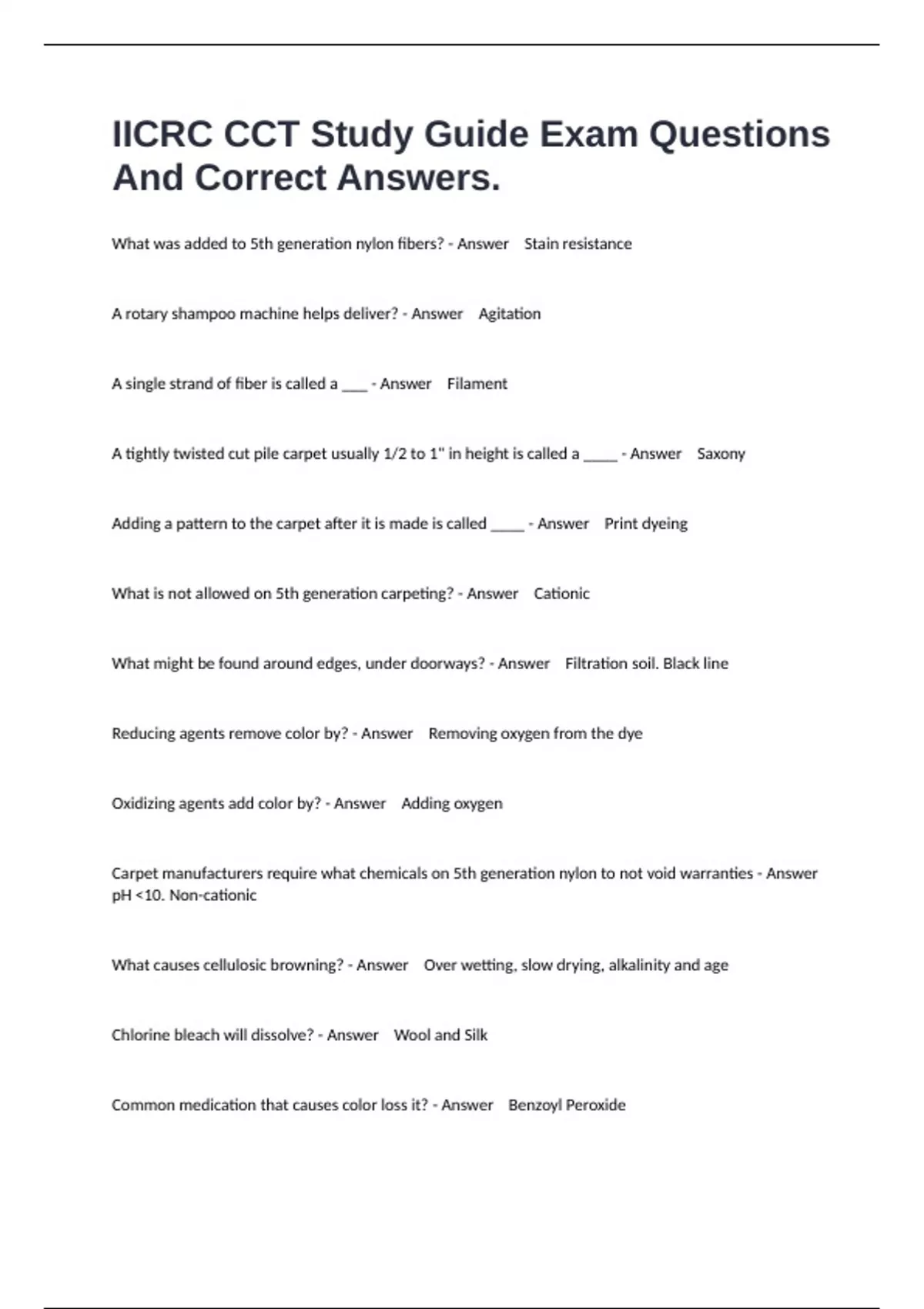 1 Exam (elaborations) Upholstery IICRC UFT Study Guide Exam And Actual Answers. 2 Exam (elaborations) UFT IICRC 5/13/2020 Exam Questions And All Complete Answers. 3 Exam (elaborations) IICRC UFT Study Guide Exam Questions 100% Well Answered. 4 Exam (elaborations) IICRC RRT Exam Study Guide Exam Fully Solved.