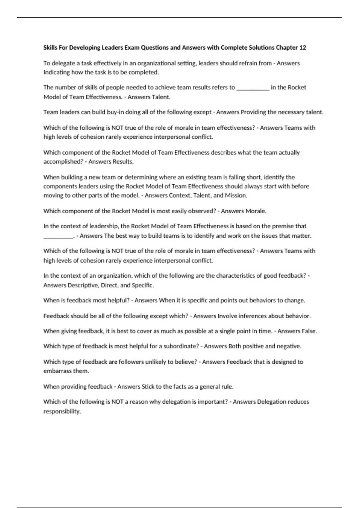 Skills For Developing Leaders Exam Questions and Answers with Complete Solutions Chapter 12