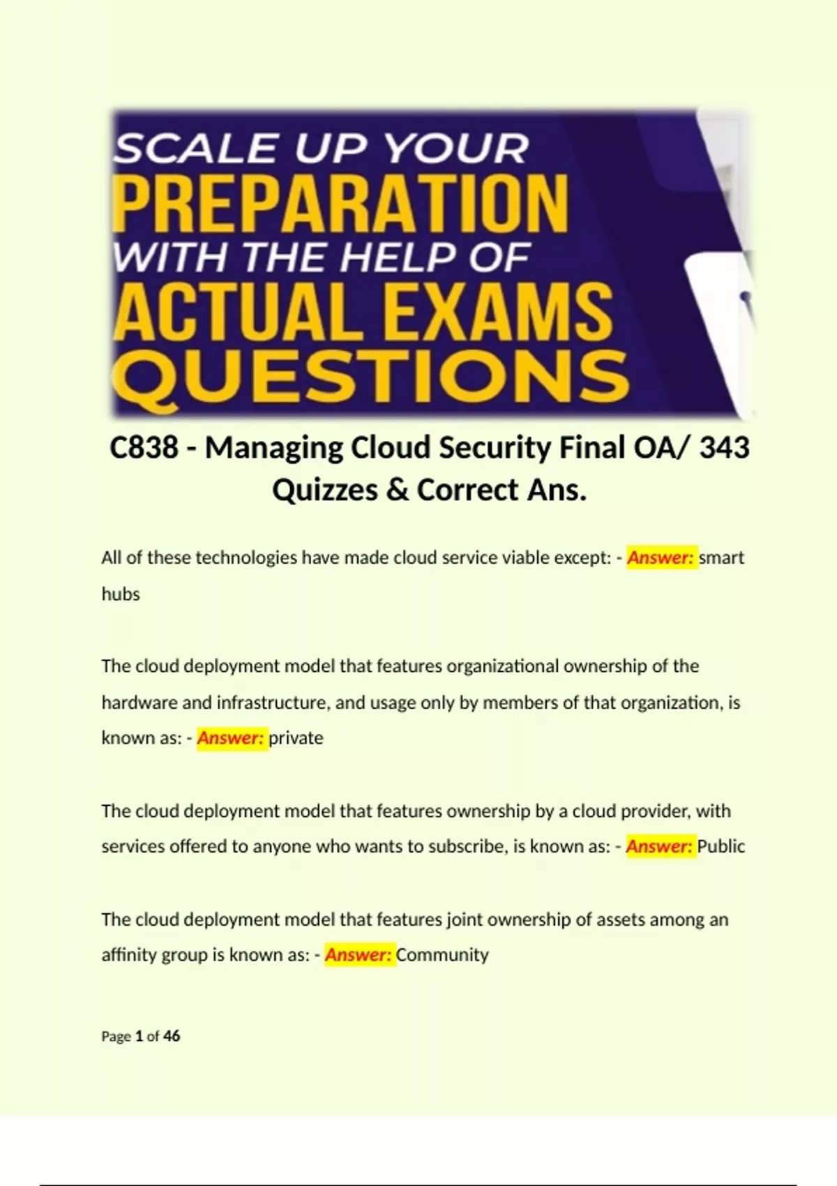 1 Exam (elaborations) C838 - Managing Cloud Security Final OA/ 343 Quizzes & Correct Ans. 2 Exam (elaborations) WGU-C838-Pre-Assessment/ 125 Questions with Certified Answers.