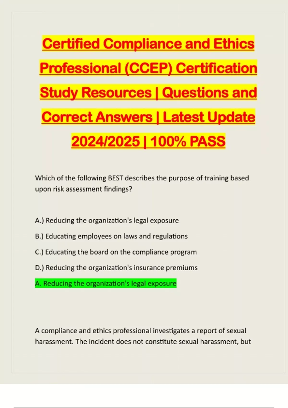 BUNDLE FOR CCEP - COMPLIANCE AND ETHICS PROFESSIONAL EXAMS:::: QUESTIONS & CORRECT ANSWERS | LATEST UPDATE 2024/2025