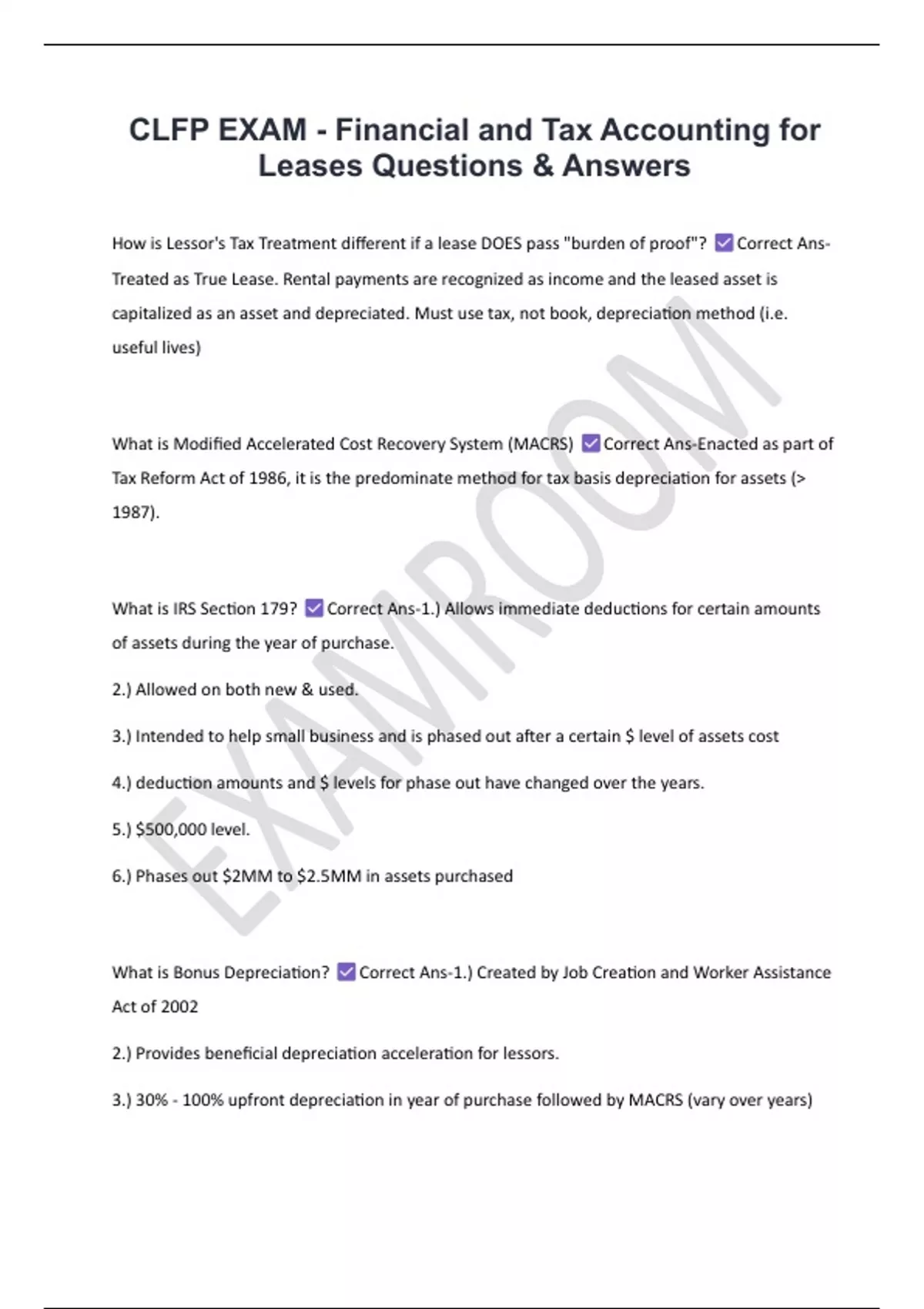 CLFP EXAM - Financial and Tax Accounting for Leases Questions & Answers 2 Exam (elaborations) CLFP - Accounting & Finance Questions & Correct Answers 3 Exam (elaborations) CLFP EXAM - Classification & Terminology in Leasing- Qs & As 4 Exam (elaborations) CLFP Exam- Leasing Law & Documentation Questions and Answer