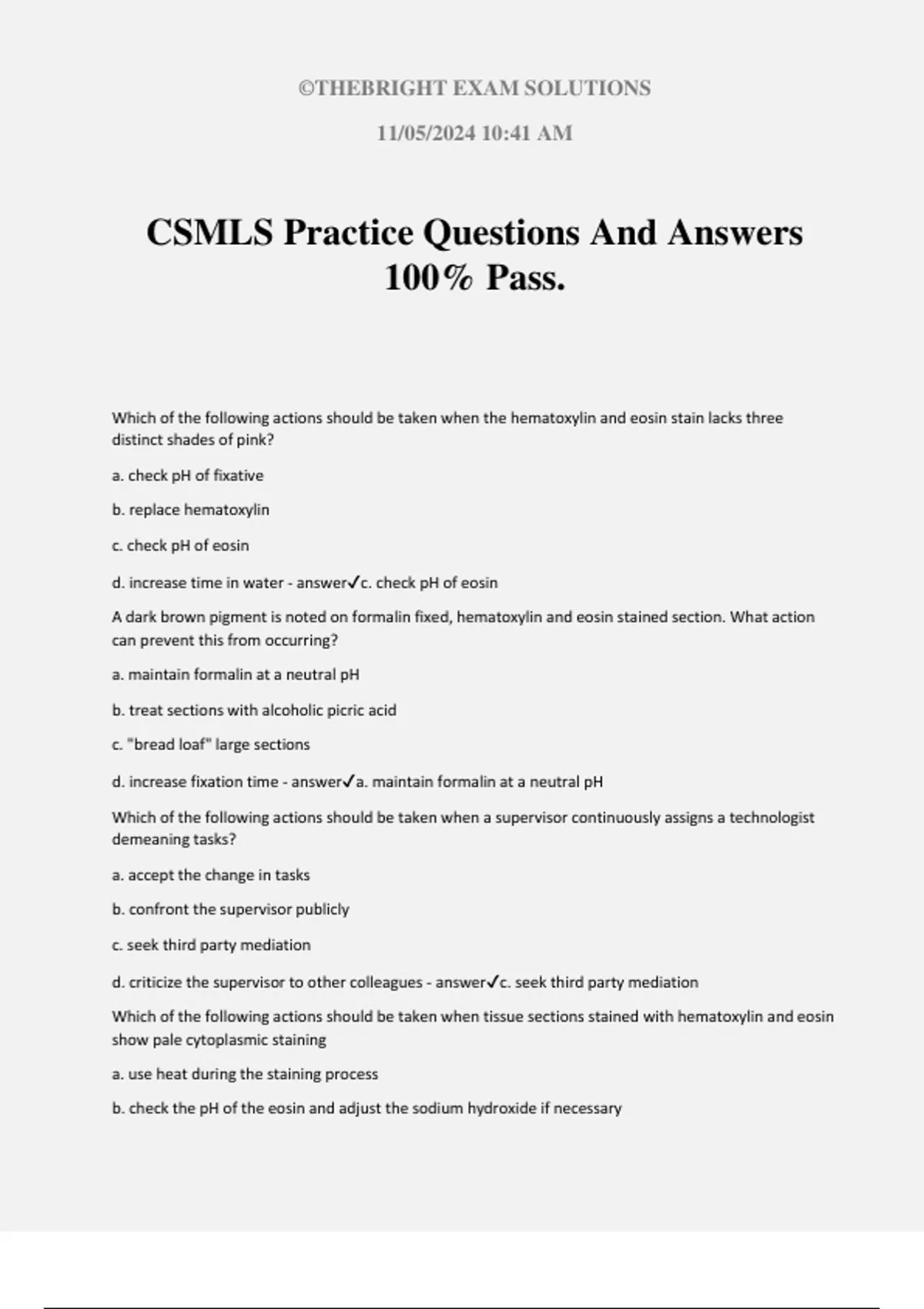 CSMLS Bundled Exam Questions And Answers 100% Solved