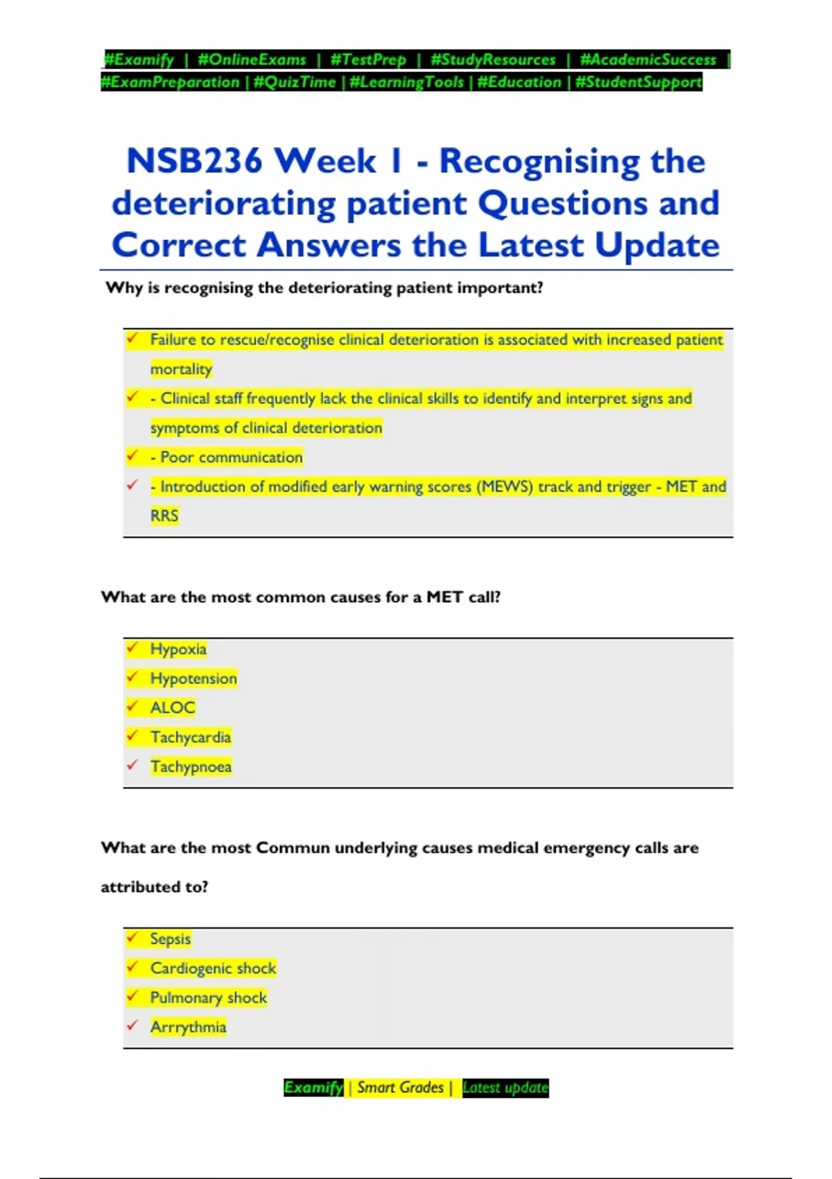 NSB236 Week 1 - Recognising the deteriorating patient Questions and Correct Answers the Latest Update