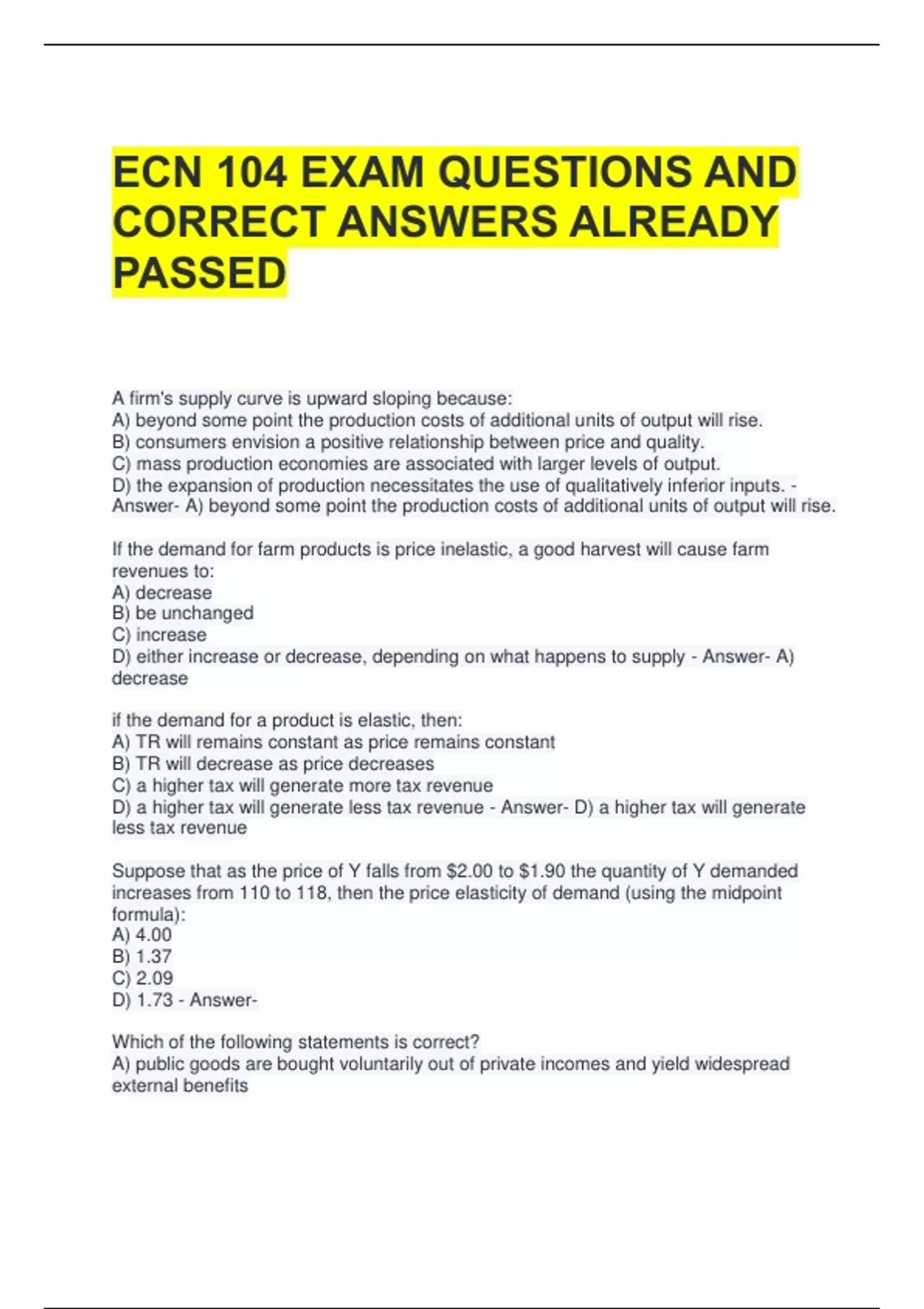 ECN 104 EXAM QUESTIONS AND CORRECT ANSWERS ALREADY PASSED 2 Exam (elaborations) ECN 104 Midterm Exam 2024 with Complete Solutions 3 Exam (elaborations) ECN 104 EXAM QUESTIONS AND ANSWERS ALL CORRECT NEW UPDATE 4 Exam (elaborations) ECN 104 QUIZ 2 QUESTIONS WITH 100% CORRECT ANSWERS 2024 LATEST UPDATE 5 Exam (elaborations) ECN 104 Chapter 7 Test