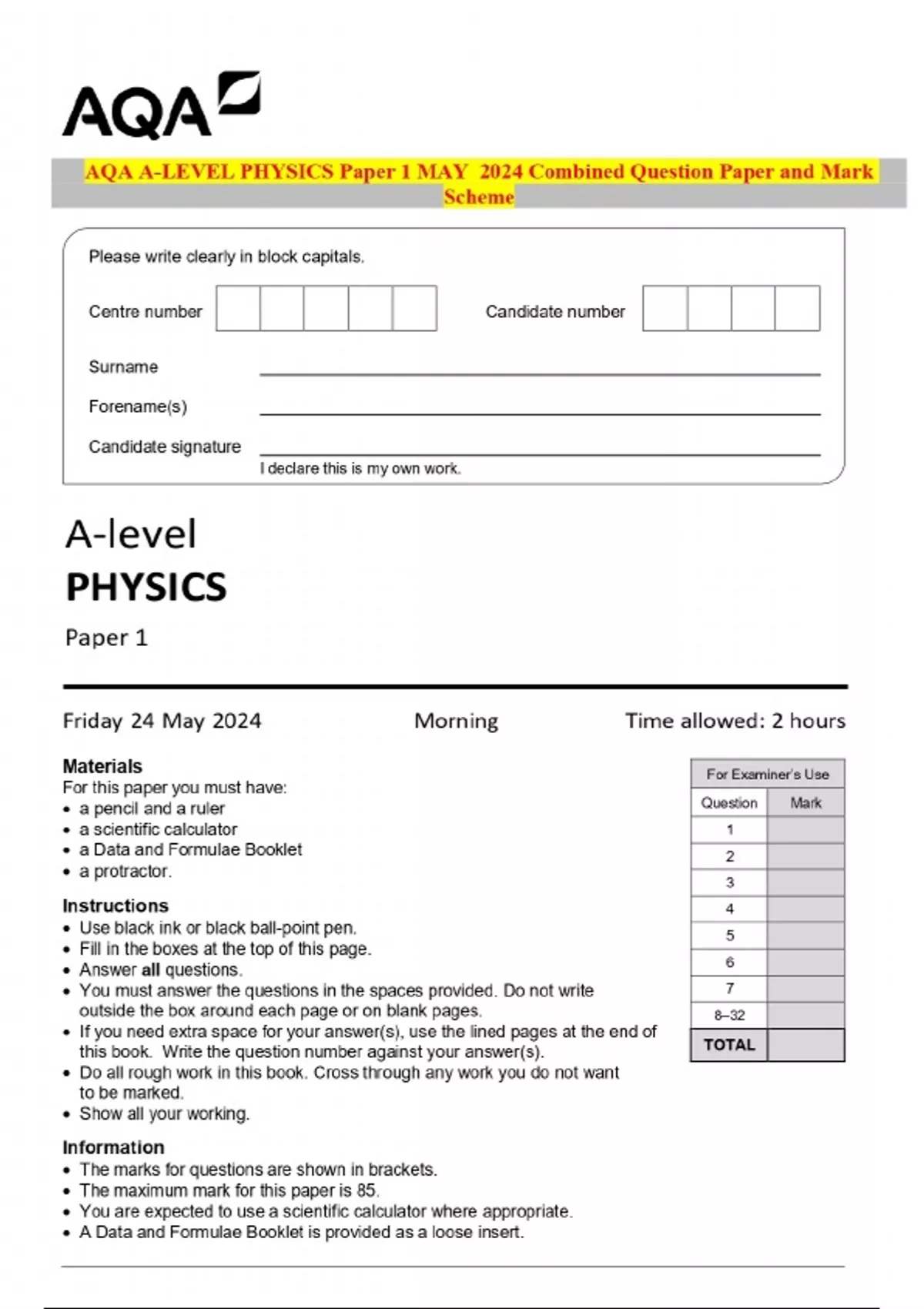 AQA A-LEVEL PHYSICS Paper 1 MAY 2024 Combined Question Paper and Mark Scheme