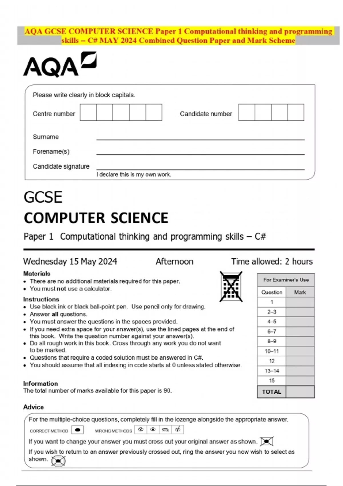 AQA GCSE COMPUTER SCIENCE Paper 1 Computational thinking and programming skills – C# MAY 2024 Combined Question Paper and Mark Scheme