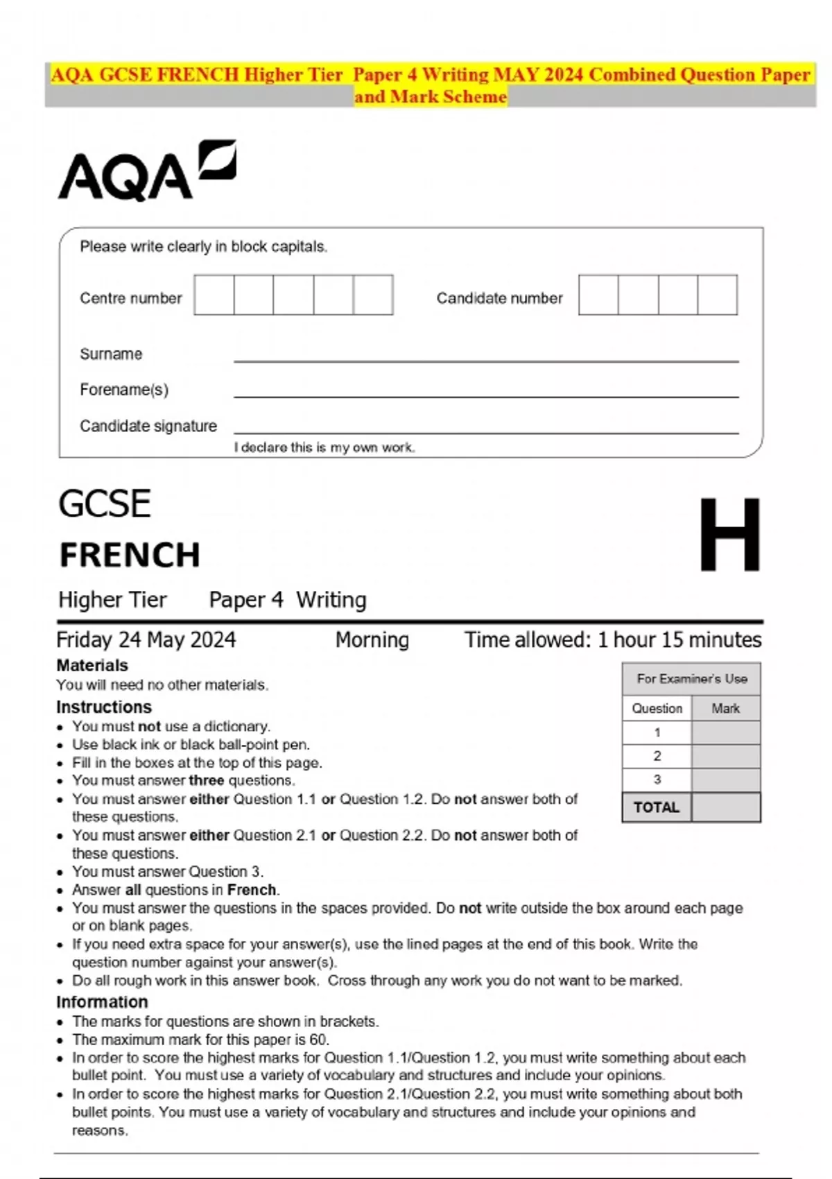 BUNDLE::: AQA GCSE FRENCH Higher Tier 2024 Combined Question Paper and Mark Scheme