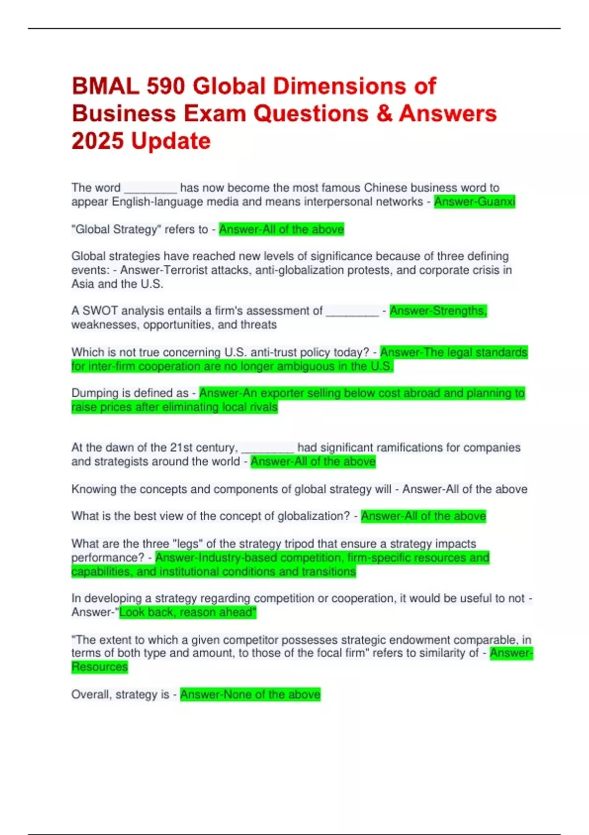 BMAL 590 Global Dimensions of Business Exam Questions & Answers 2025 Update