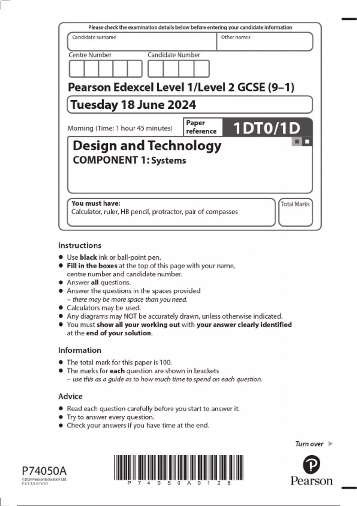 2024 EDEXCEL GCSE DESIGN AND TECHNOLOGY COMPONENT 1: SYSTEMS INCLUDING MARK SCHEME