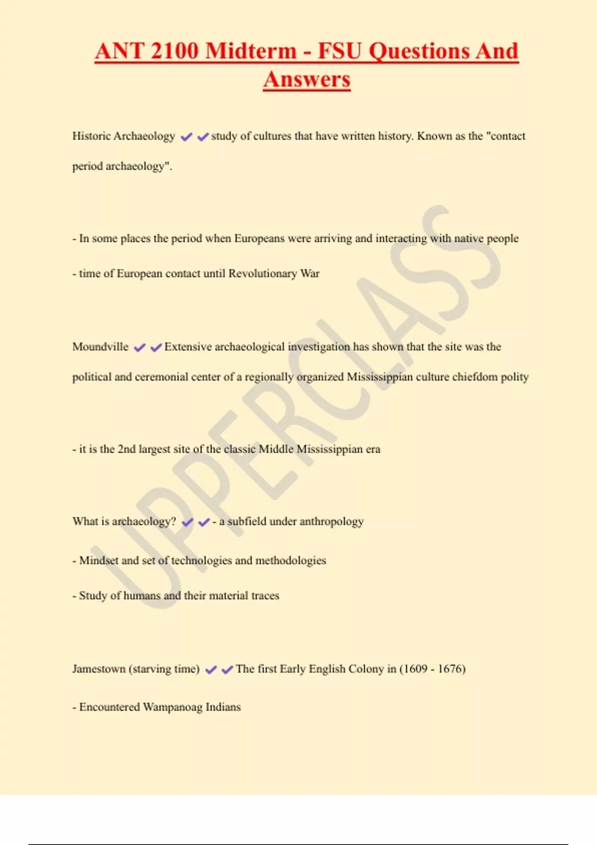 ANT 2100 Midterm - FSU Questions And Answers 2 Exam (elaborations) ANT 2100 Quiz #1 Questions And Answers 3 Exam (elaborations) ANT 2100 Final Exam Chapter 7-13 Questions And Answers 4 Exam (elaborations) ANT 2100 Final Questions And Answers 5 Exam (elaborations) Ant 2100 FSU Mehta Introduction to Archaeology Midterm (Chp 1-6) *means he said to