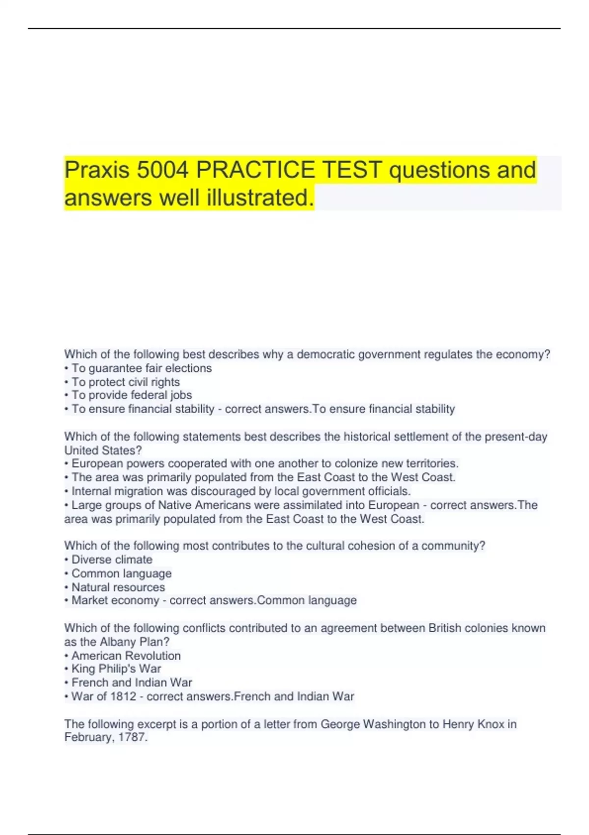 Praxis 5004 (history) Kathleen Jasper Practice Test questions and answers well illustrated.Praxis 5622 Questions And Answers Rated A+.Praxis II Elementary Education: Social Studies 5004 questions and answers latest top score.Praxis PLT Grades: 7-12 Questions And Answers Latest Top Score.