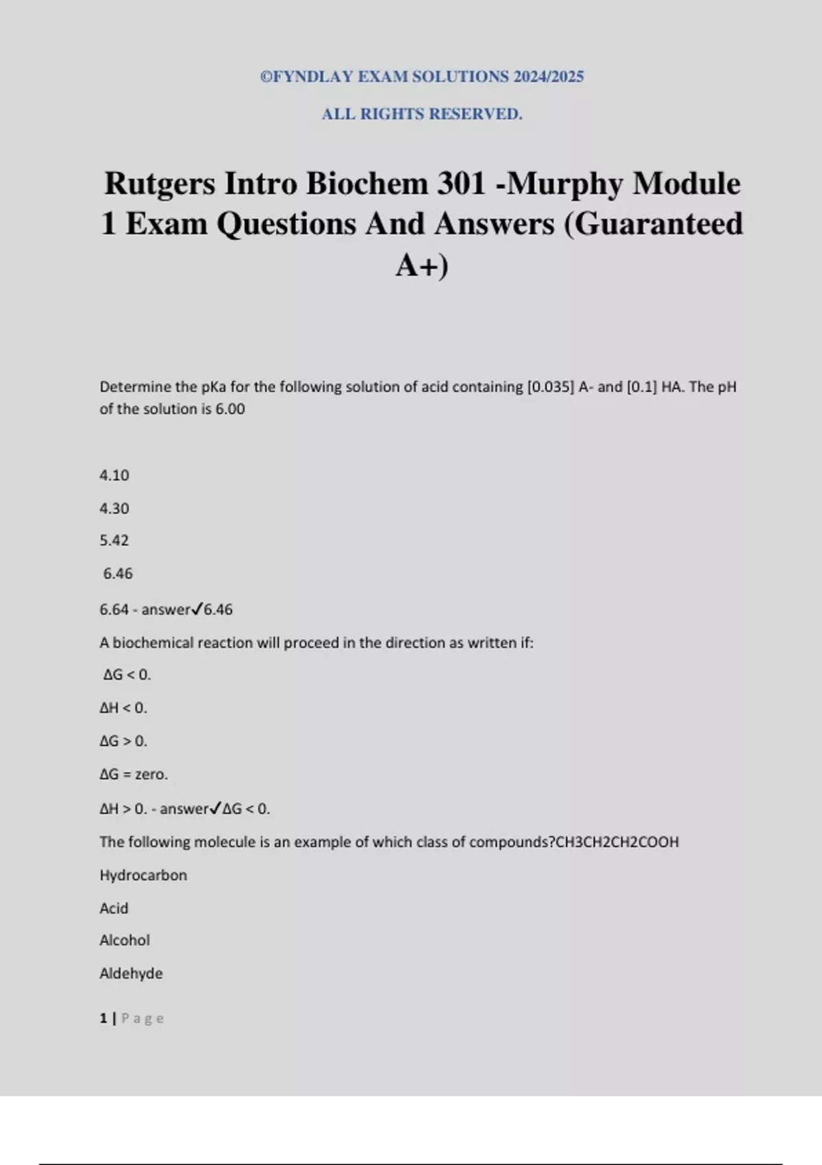Rutgers Intro Biochem 301 -Murphy Module 1 Exam Questions And Answers (Guaranteed A+)