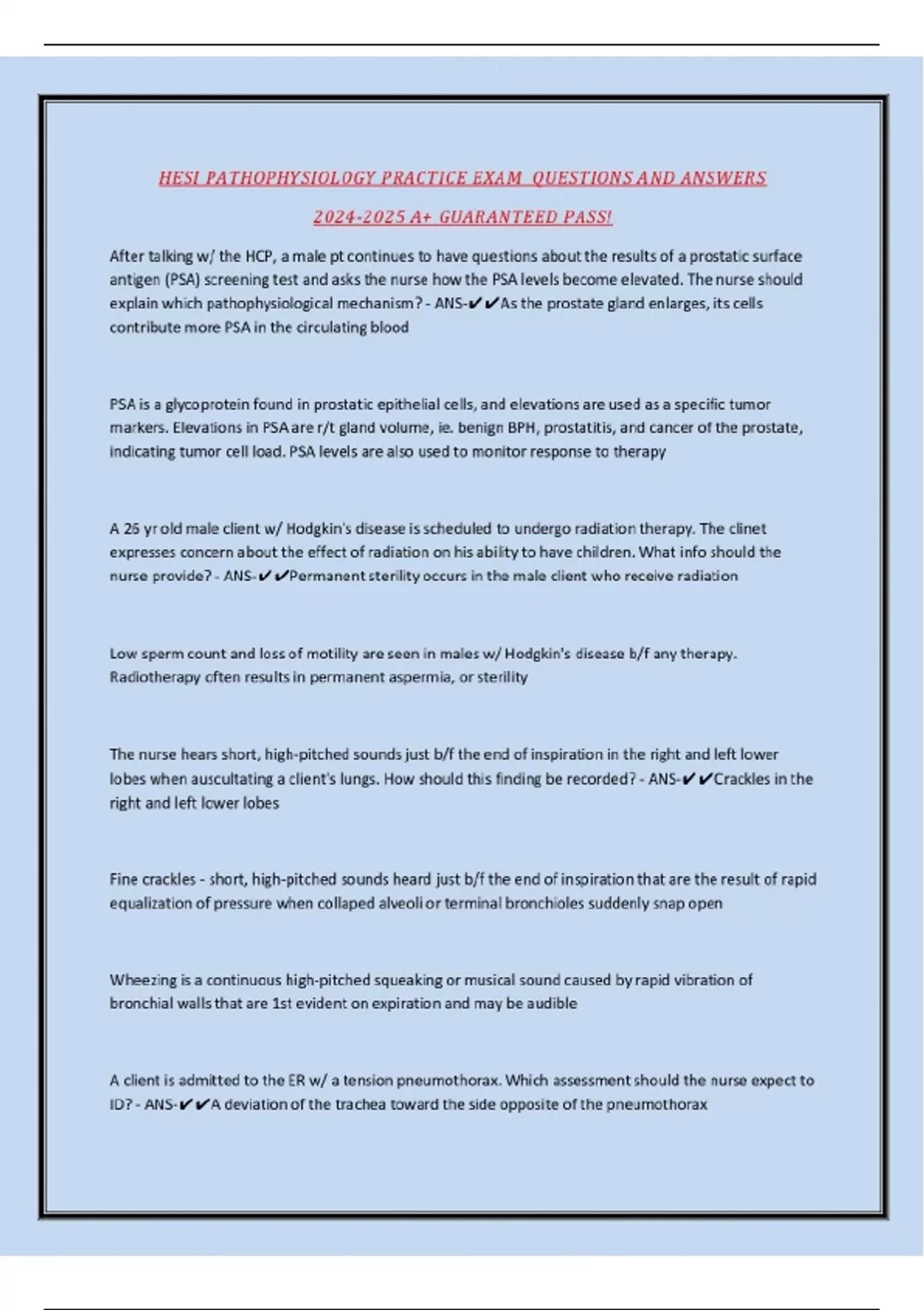 HESI PATHO, PRACTICE QUESTIONS AND ANSWERS+RATIONALES PART 1 A+ GRADE, HESI PATHO, PRACTICE QUESTIONS AND ANSWERS + RATIONALES PART 2 A+ GRADE & HESI PATHOPHYSIOLOGY PRACTICE EXAM QUESTIONS AND ANSWERS A+ GUARANTEED PASS!. Pa