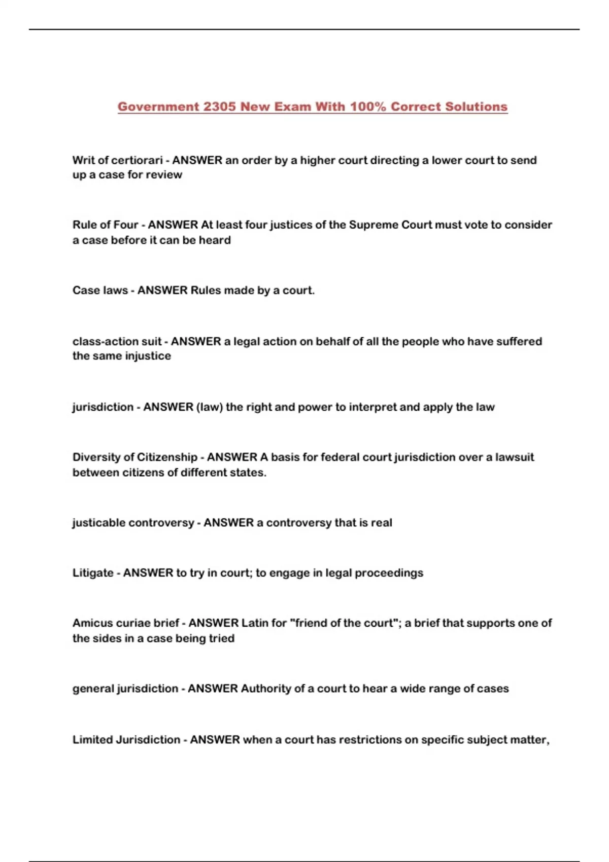 Government 2305 New Exam With All Questions And Correct Answers (A+) Latest Update 100% Verified