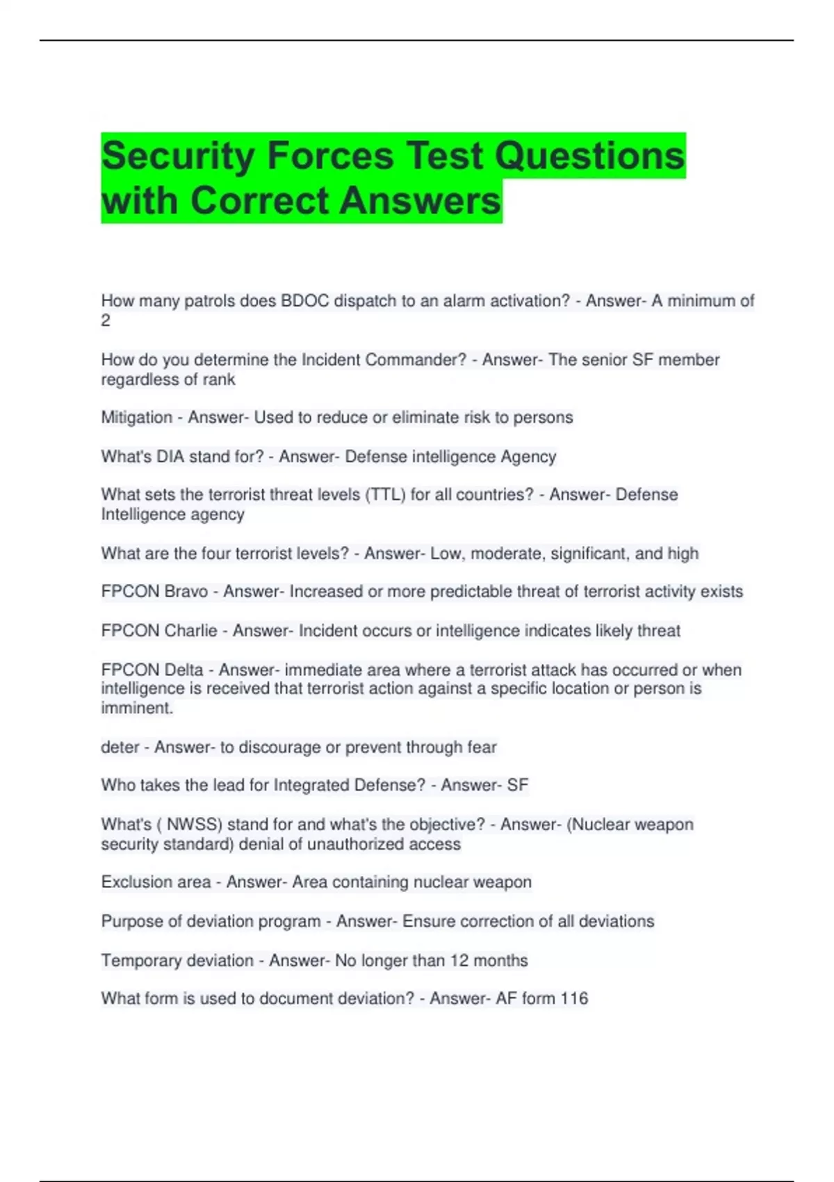 Security Forces Test Questions with Correct Answers 2 Exam (elaborations) Security Forces Exam Questions and Correct Answers Already Passed 3 Exam (elaborations) Security Forces Exam Questions with All Correct Answers 4 Exam (elaborations) Security Forces Exam Questions with 100% Correct Answers 5 Exam (elaborations) Security Forces General Kno