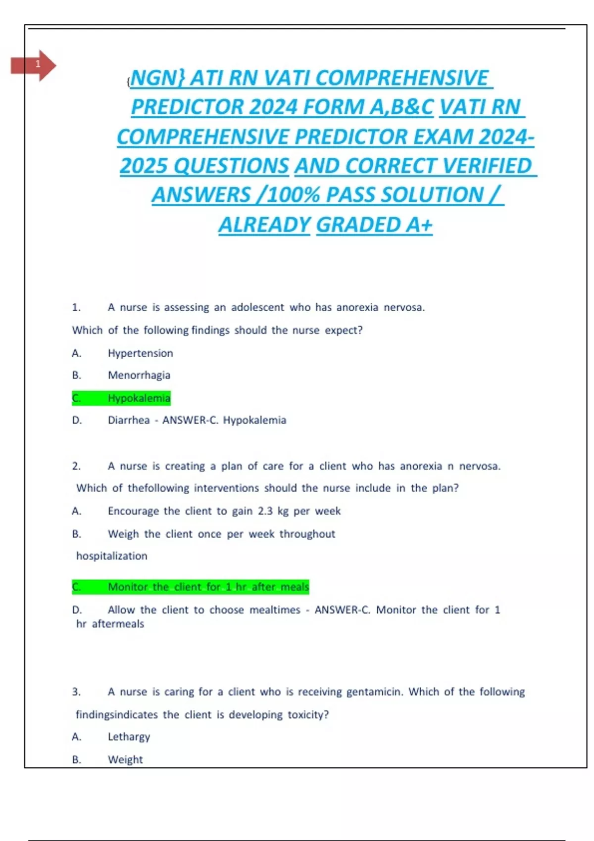 RN VATI Comprehensive Predictor Exam & Form A, B, & C, Exam with NGN Questions and Verified Correct Answers, 100% Guaranteed Pass 2024/2025 ||Complete A Guide