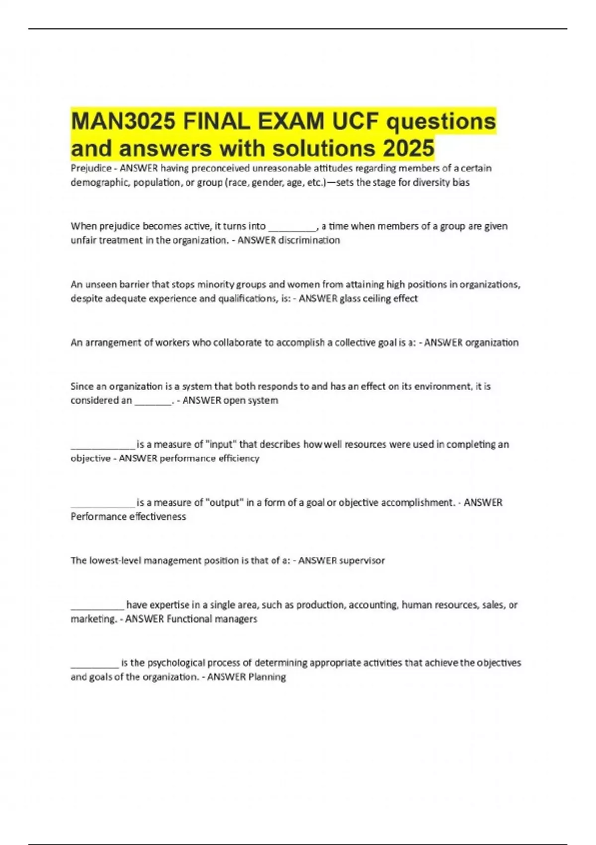 MAN 3025 TERMS - UCF final exam questions and answers with solutions 2025