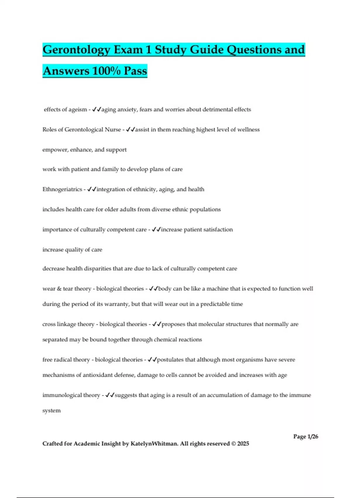 Gerontology Bundled Exams Questions and Answers 100% Pass, Revised Edition 2024