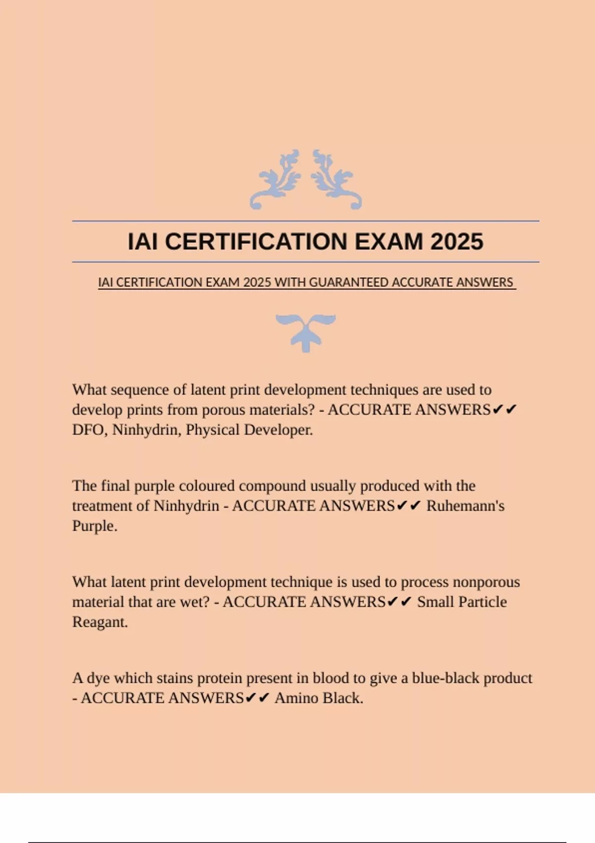 IAI CERTIFICATION EXAM 2025 WITH GUARANTEED ACCURATE ANSWERS IAI CERTIFICATION EXAM 2025 WITH GUARANTEED ACCURATE ANSWERS |SOLVED!! IAI CERTIFICATION EXAM 2025 WITH GUARANTEED ACCURATE ANSWERS |VERIFIED IAI CSI CERTIFICATION REVIEW QUESTIONS WITH GUARANTEED ACCURATE ANSWERS