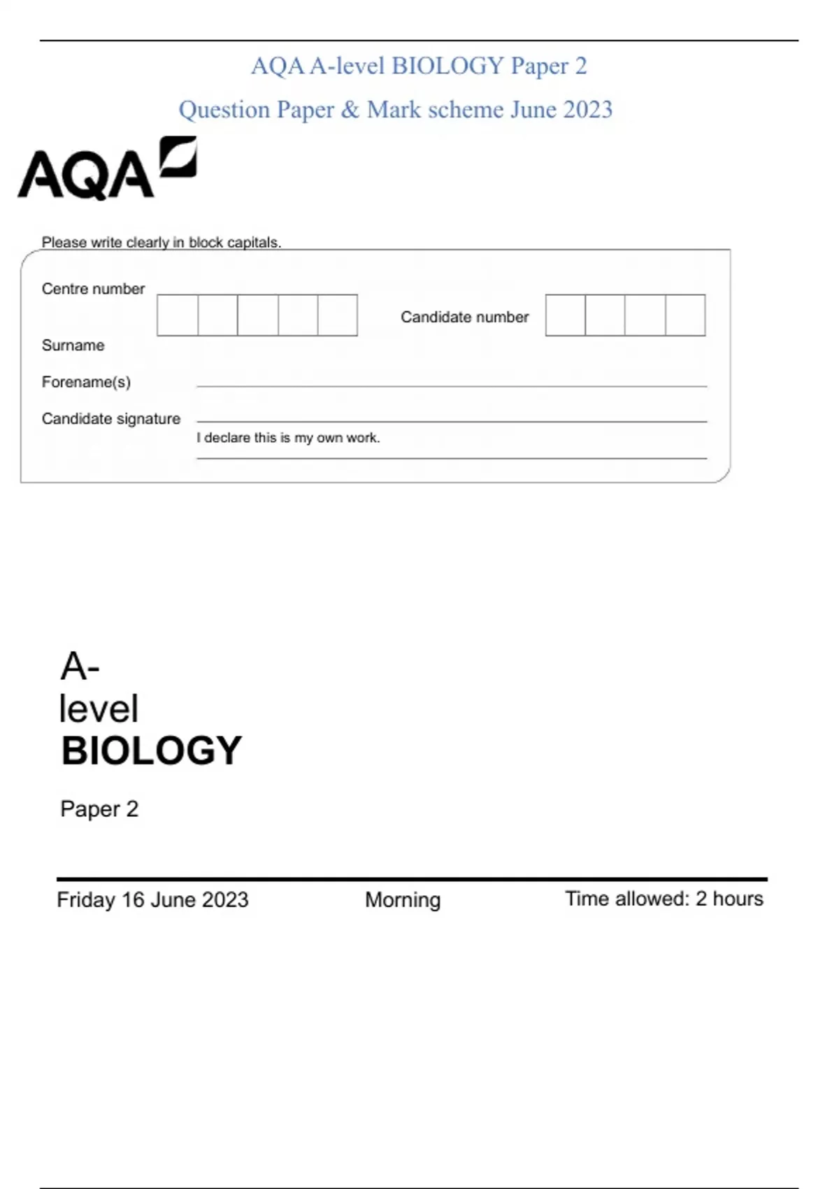 AQA A-level BIOLOGY Paper 2 Question Paper & Mark scheme June 2023