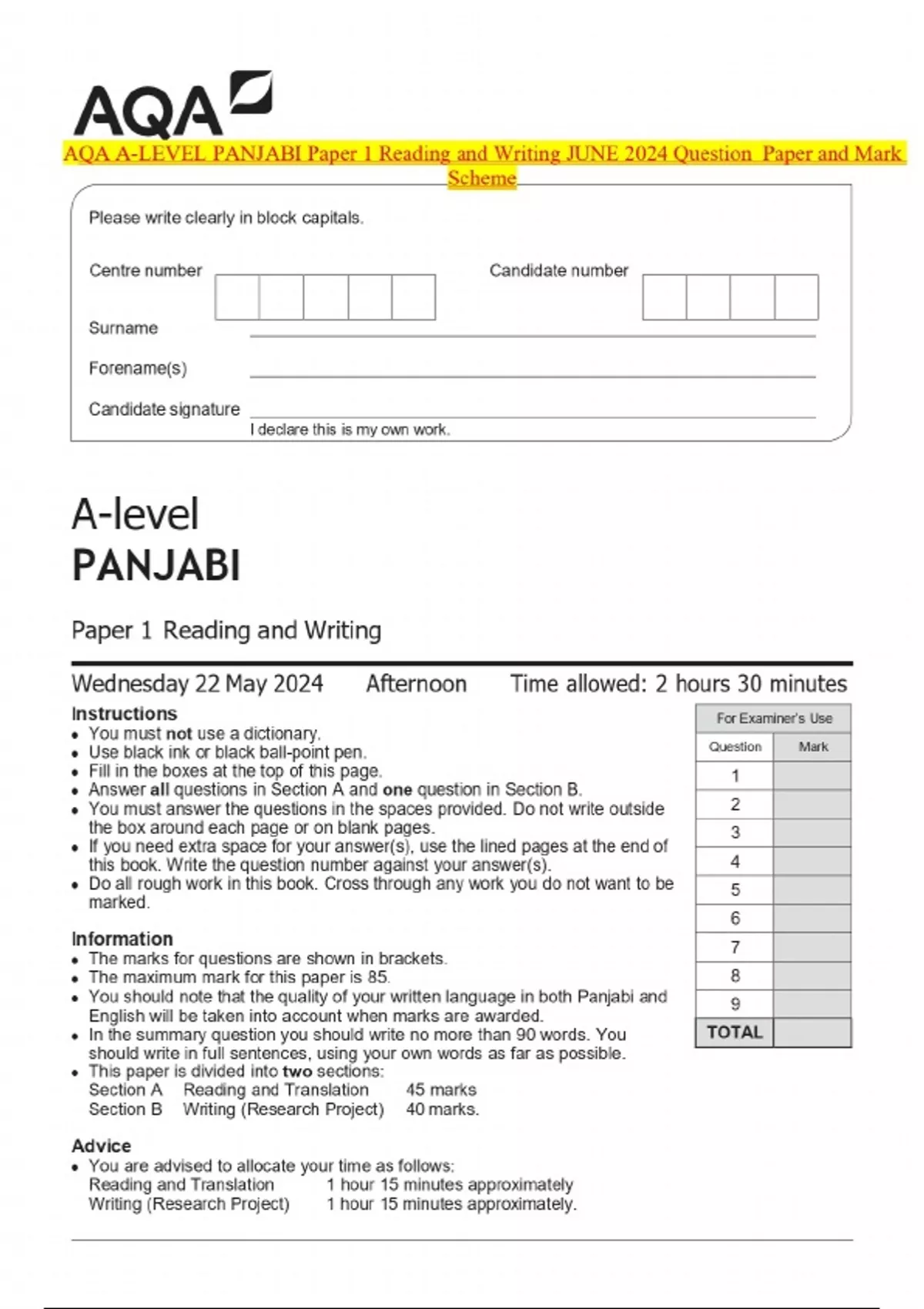 AQA A-LEVEL PANJABI Paper 1 Reading and Writing JUNE 2024 Question Paper and Mark Scheme
