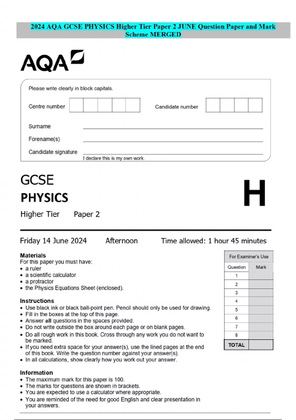 2024 AQA GCSE PHYSICS Higher Tier Paper 1 MAY Question Paper and Mark Scheme MERGED