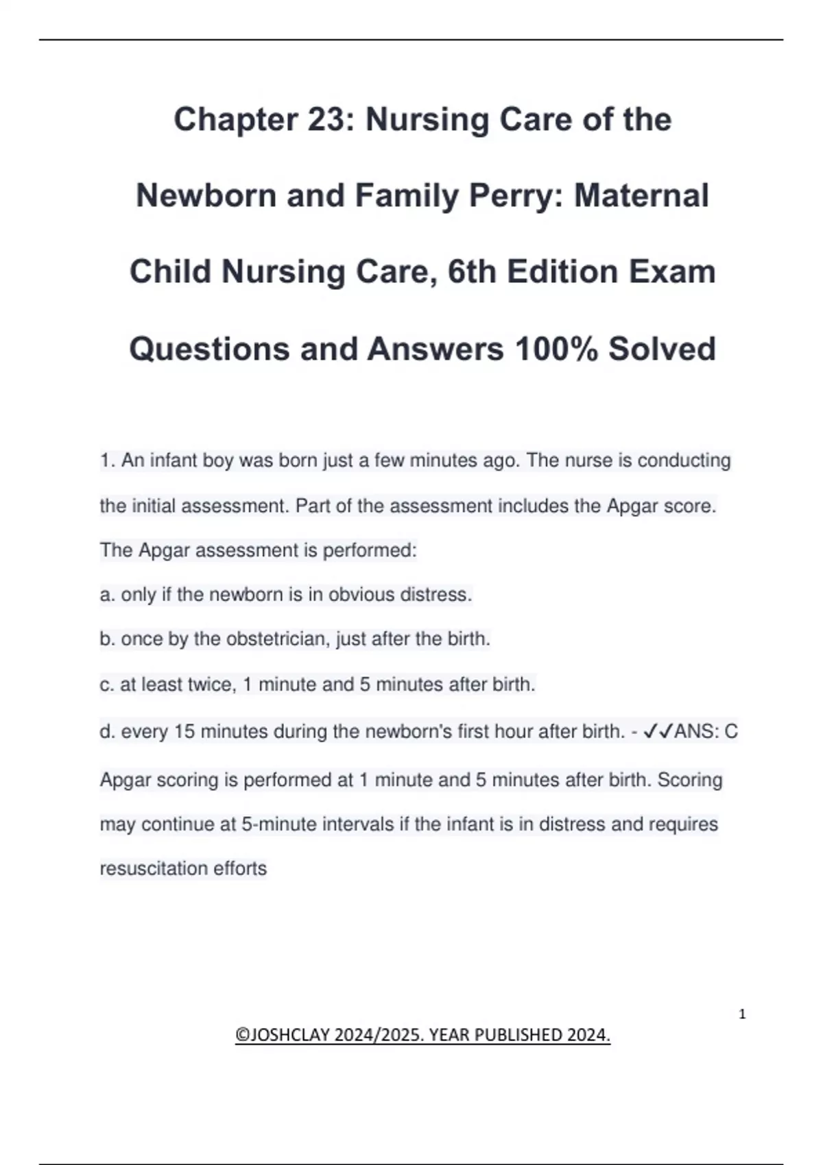Chapter 23: Nursing Care of the Newborn and Family Perry: Maternal Child Nursing Care, 6th Edition Exam Questions and Answers 100% Solved