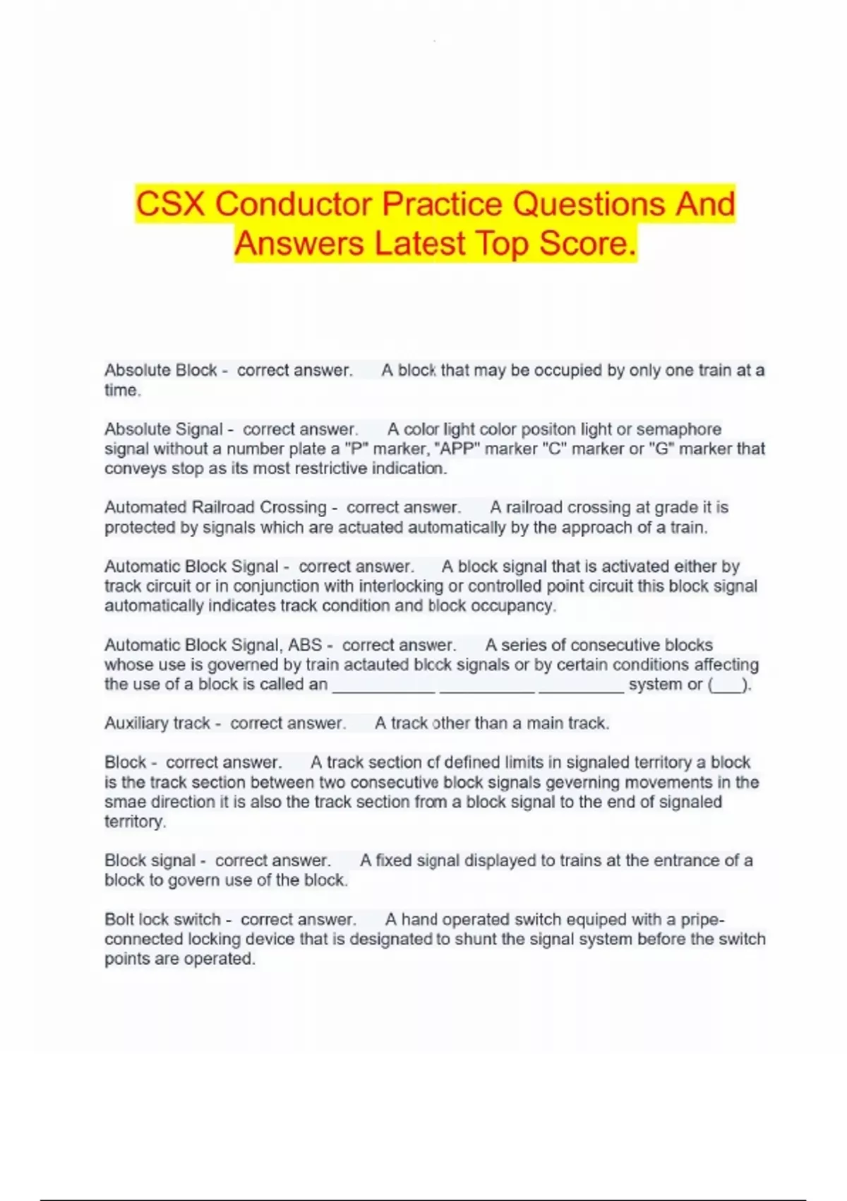 CSX - Freight Conductor Final Questions And Answers Graded A+.CSX Conductor Week 2 Test Verified And Updated.CSX Conductor Practice Questions And Answers Latest Top Score.CSX Conductor Training Week 1 Test Review Questions And Answers Latest Top Score.