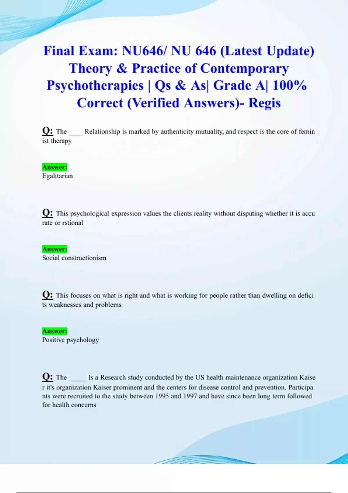 Final Exam: NU646/ NU 646 (Latest 2024/ 2025 Update) Theory & Practice of Contemporary Psychotherapies Review| Qs & As| Grade A| 100% Correct (Verified Answers)- Regis