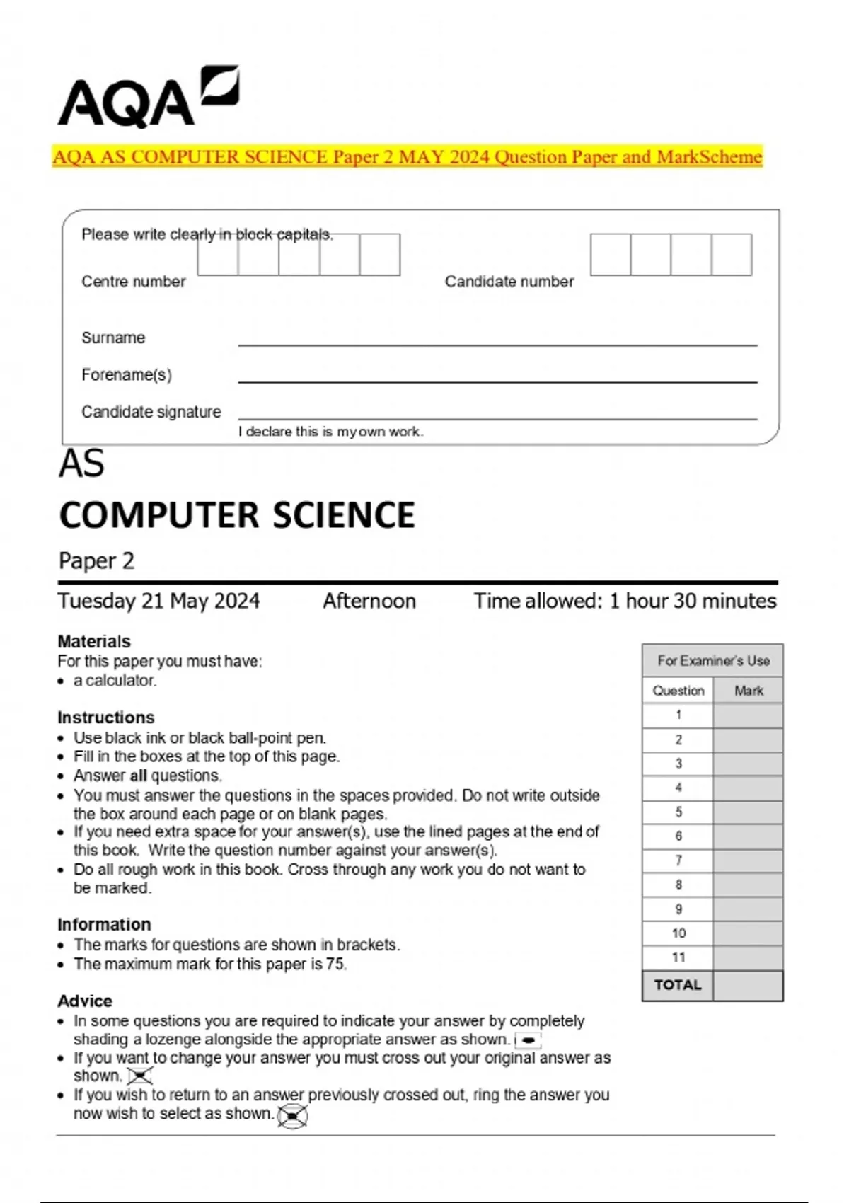 BUNDLED AQA AS –LEVEL COMPUTER SCIENCE 2024 Question Paper and Mark Scheme