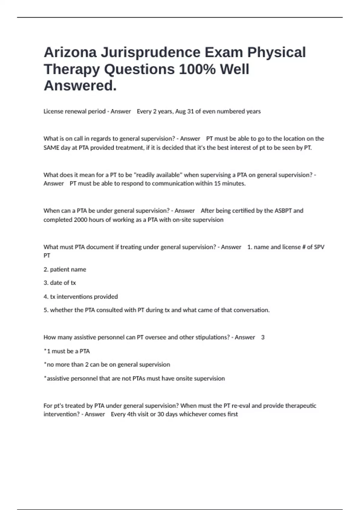 1 Exam (elaborations) Jurisprudence Exam for Arizona State Board of Physical Therapy Questions With Solved Solutions. 2 Exam (elaborations) AZ PT Jurisprudence Final Exam Questions And Correct Answers. 3 Exam (elaborations) AZ Law Study Guide Exam Questions And Actual Answers. 4 Exam (elaborations) Arizona Jurisprudence Exam Physical Therapy Que