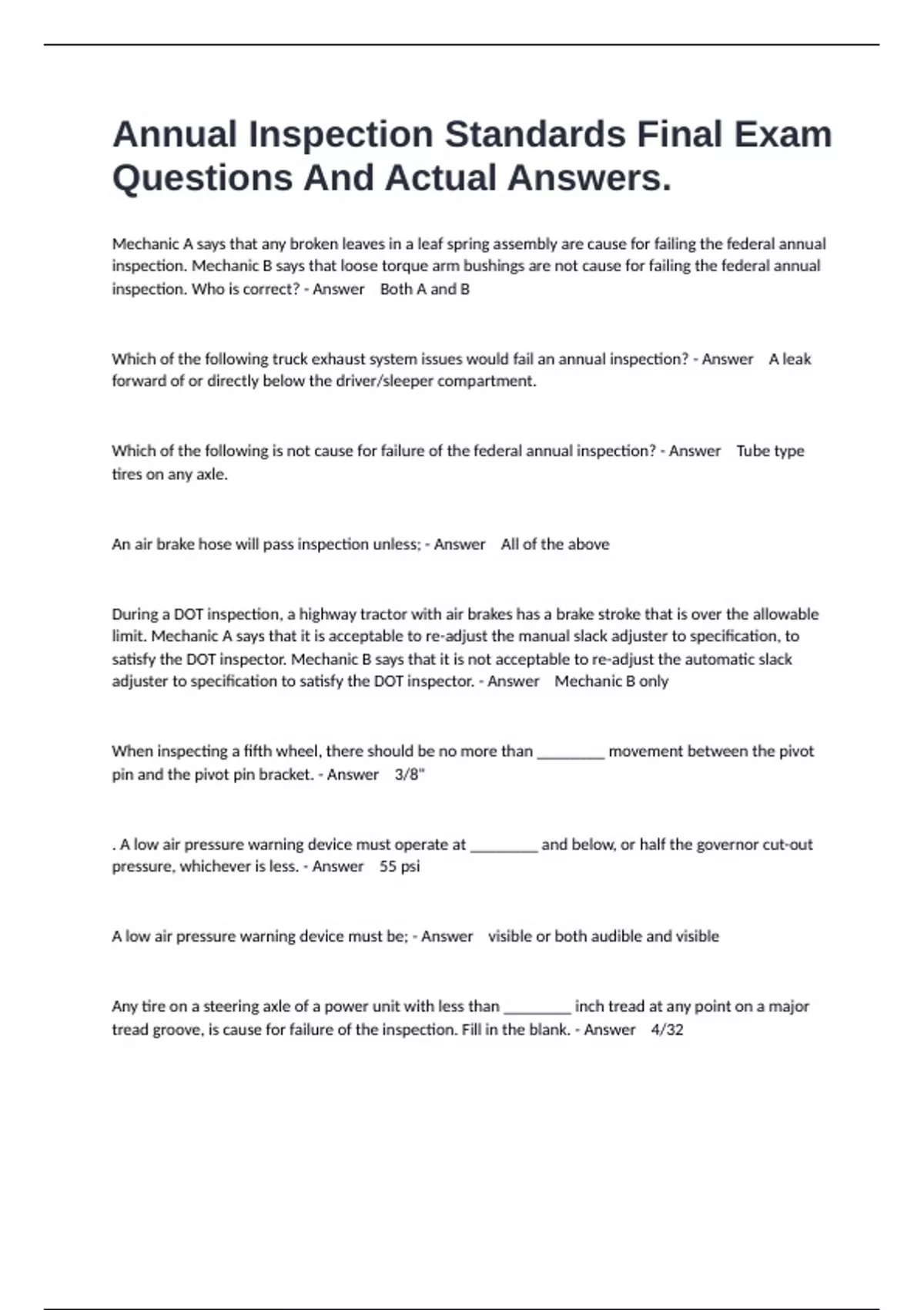1 Exam (elaborations) AF215-Airframe Inspection Study Guide Exam Questions And Actual Answers. 2 Exam (elaborations) Texas Vehicle Inspector TXDPS Study Guide Exam And All Correct Answers. 3 Exam (elaborations) Safety and Emissions Test Questions And Accurate Answers. 4 Exam (elaborations) Maryland State Inspection-technical Exam Study Questions