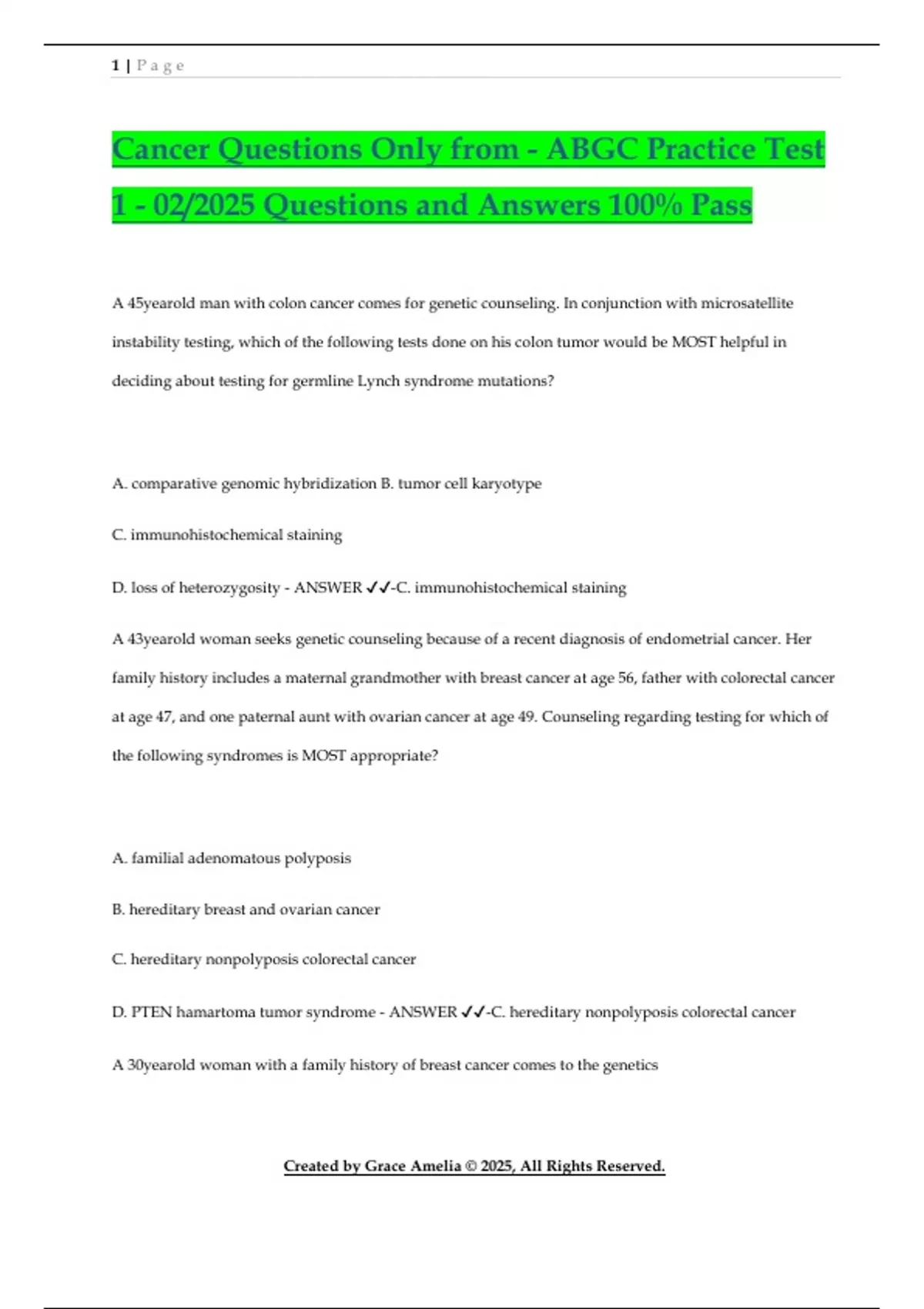 Cancer Questions Only from - ABGC Practice Test 1 - 02/2025 Questions and Answers 100% Pass