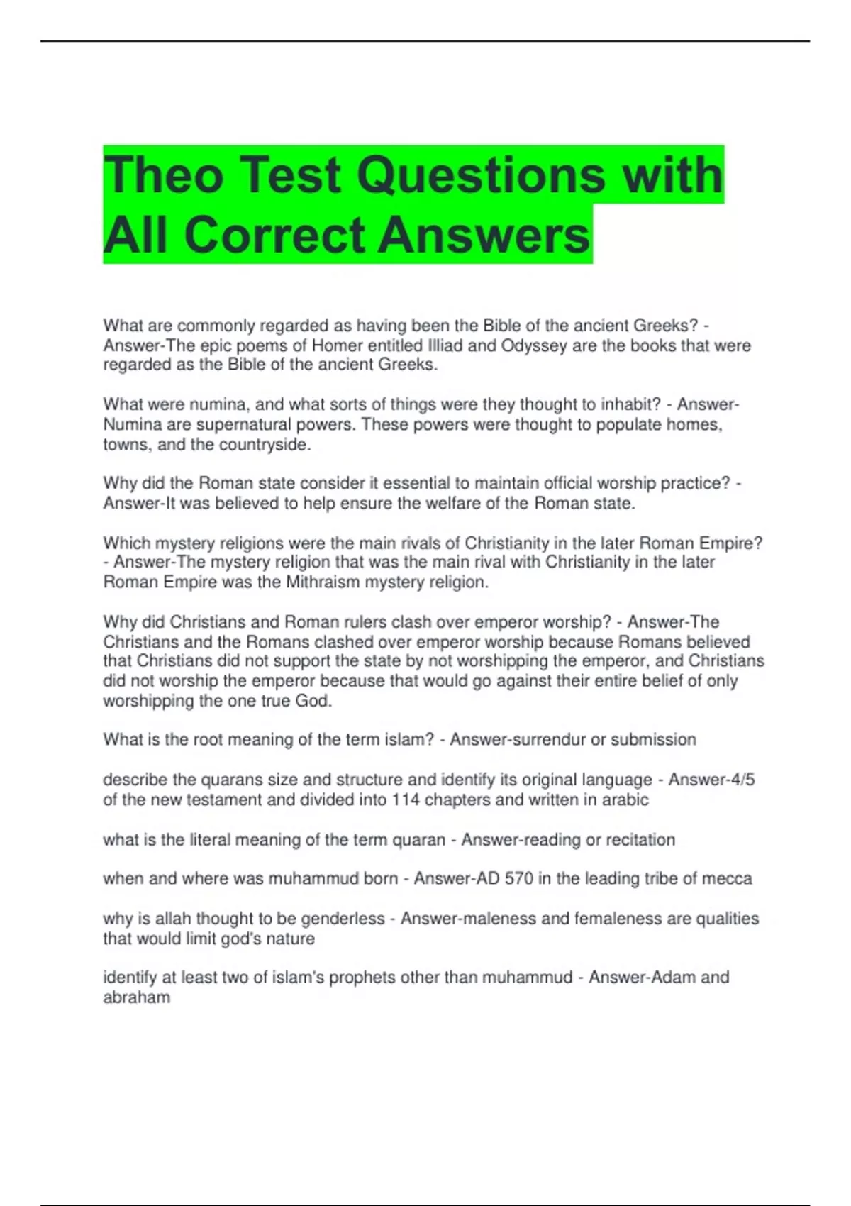 Theo Test Questions with All Correct Answers 2 Exam (elaborations) Theo CH 6 Test Questions and Answers All Correct 3 Exam (elaborations) THEO Quiz 8 Questions with All Correct Answers 4 Exam (elaborations) THEO Quiz 6 Questions with Correct Answers 5 Exam (elaborations) Theo Final Exam Questions with 100% Correct Answers 6 Exam (elaborations)