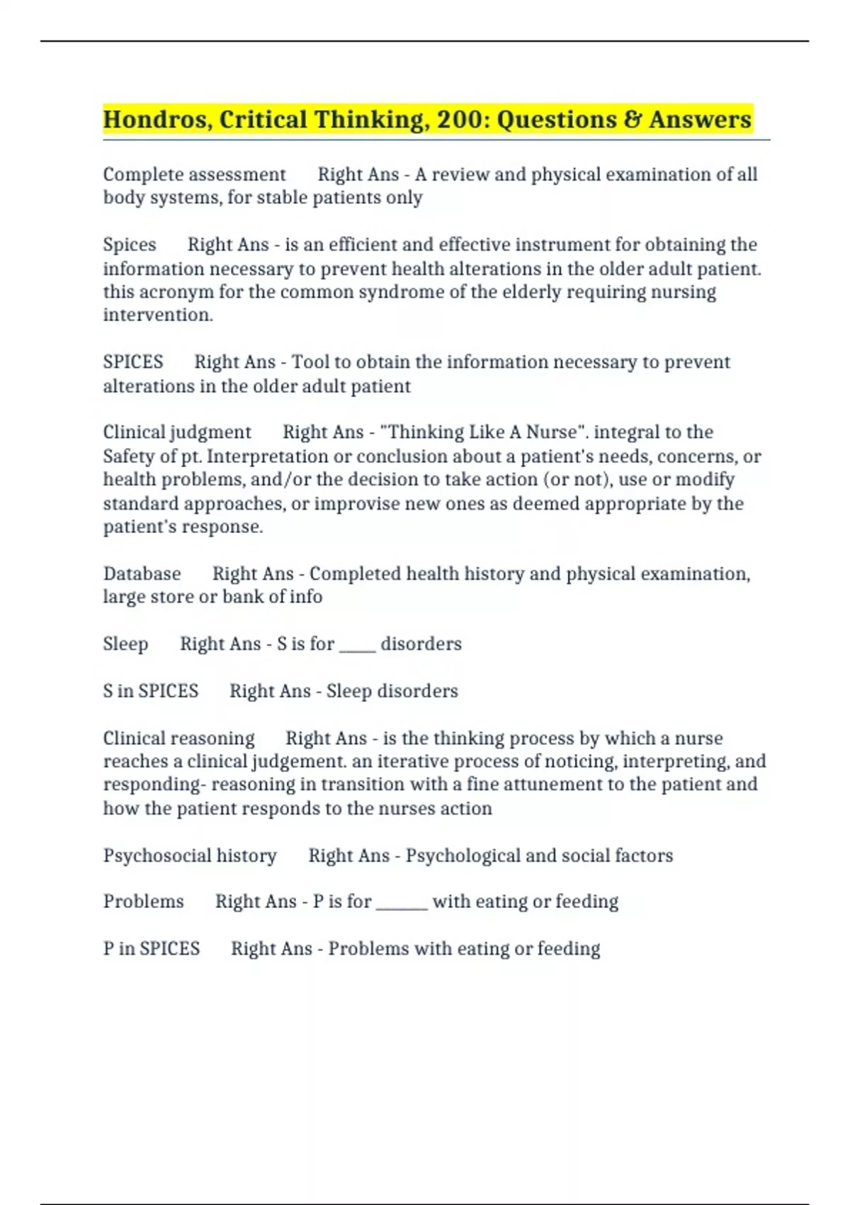 BUNDLE:- NUR 200 CRITICAL THINKING EXAMS - HONDROS