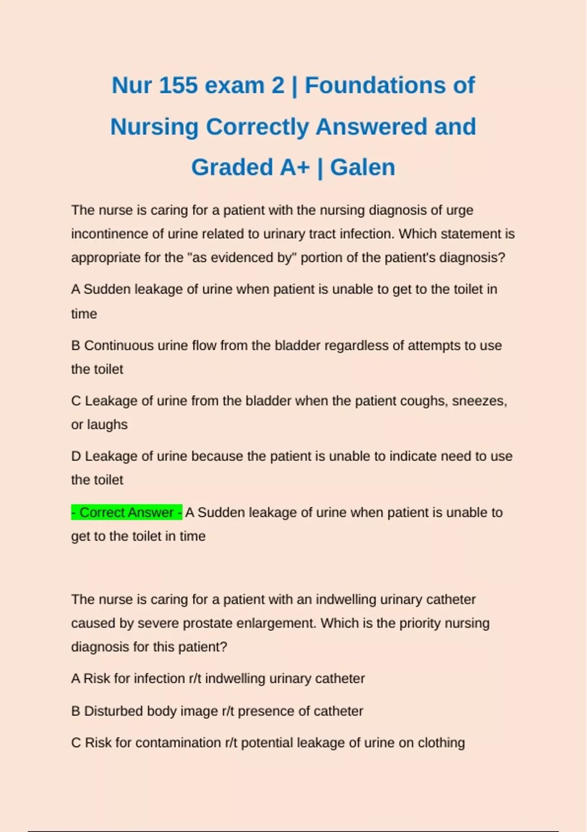 Nur 155 exam 2 | Foundations of Nursing Correctly Answered and Graded A+ | Galen