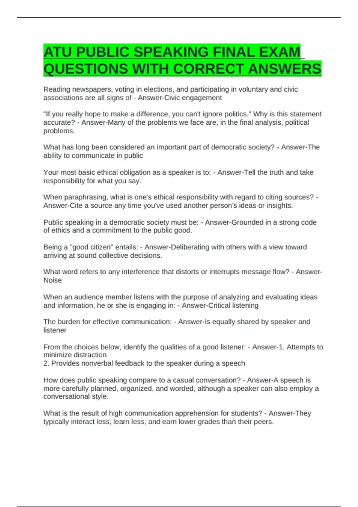PUBLIC SPEAKING TEST REVIEW QUESTIONS AND ANSWERS 2 Exam (elaborations) PUBLIC SPEAKING EXAM QUESTIONS WITH COMPLETE ANSWERS 3 Exam (elaborations) PUBLIC SPEAKING EXAM 3 QUESTIONS AND ANSWERS 4 Exam (elaborations) PUBLIC SPEAKING EXAM 1: CHAPTER 11 & 12 QUESTIONS WITH CORRECT ANSWERS 5 Exam (elaborations) PUBLIC SPEAKING EXAM 1 (RUTGERS) QUESTI