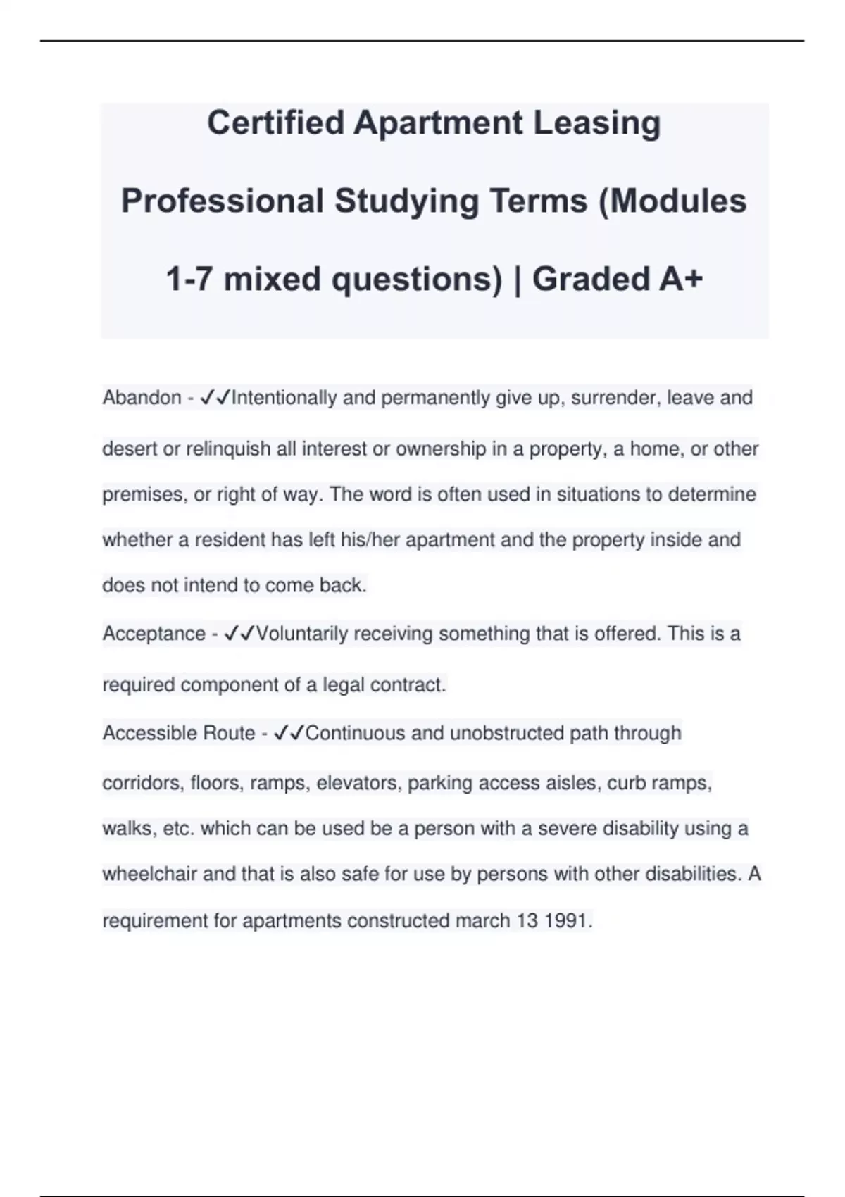 Certified Apartment Leasing Professional Studying Terms (Modules 1-7 mixed questions) | Graded A+