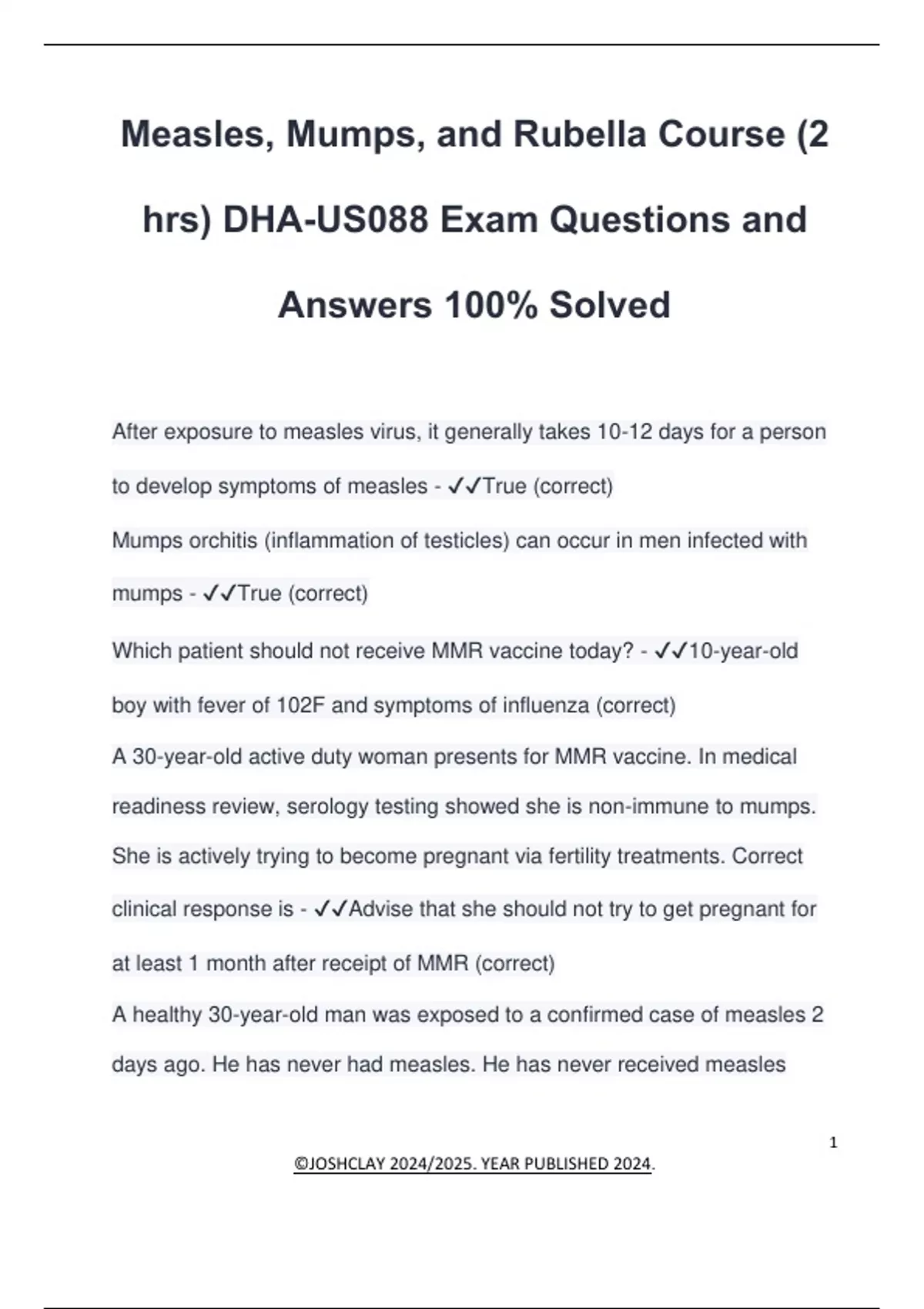 Measles, Mumps, and Rubella Course (2 hrs) DHA-US088 Exam Questions and Answers 100% Solved