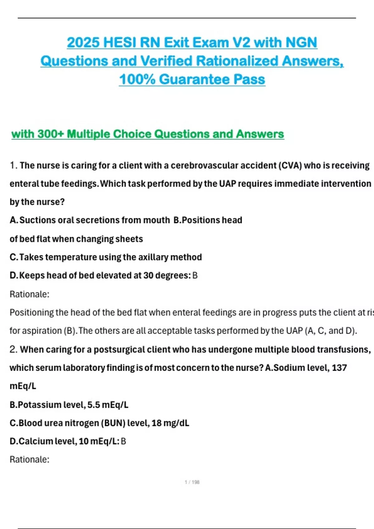 HESI RN Exit Exam V1 2025 with NGN Questions and Verified Rationalized Answers, 100% Guarantee Pass A+ Graded 2025 HESI RN Exit Exam V3 with NGN Questions and Verified Answers, 100% Guarantee Pass 2025 HESI Rn Exit Exam V3 with NGN Questions and Verified Rationalized Answers, 100% Guarantee Pass A+ Graded HESI RN Exit Exam V4 2025 with NGN Question