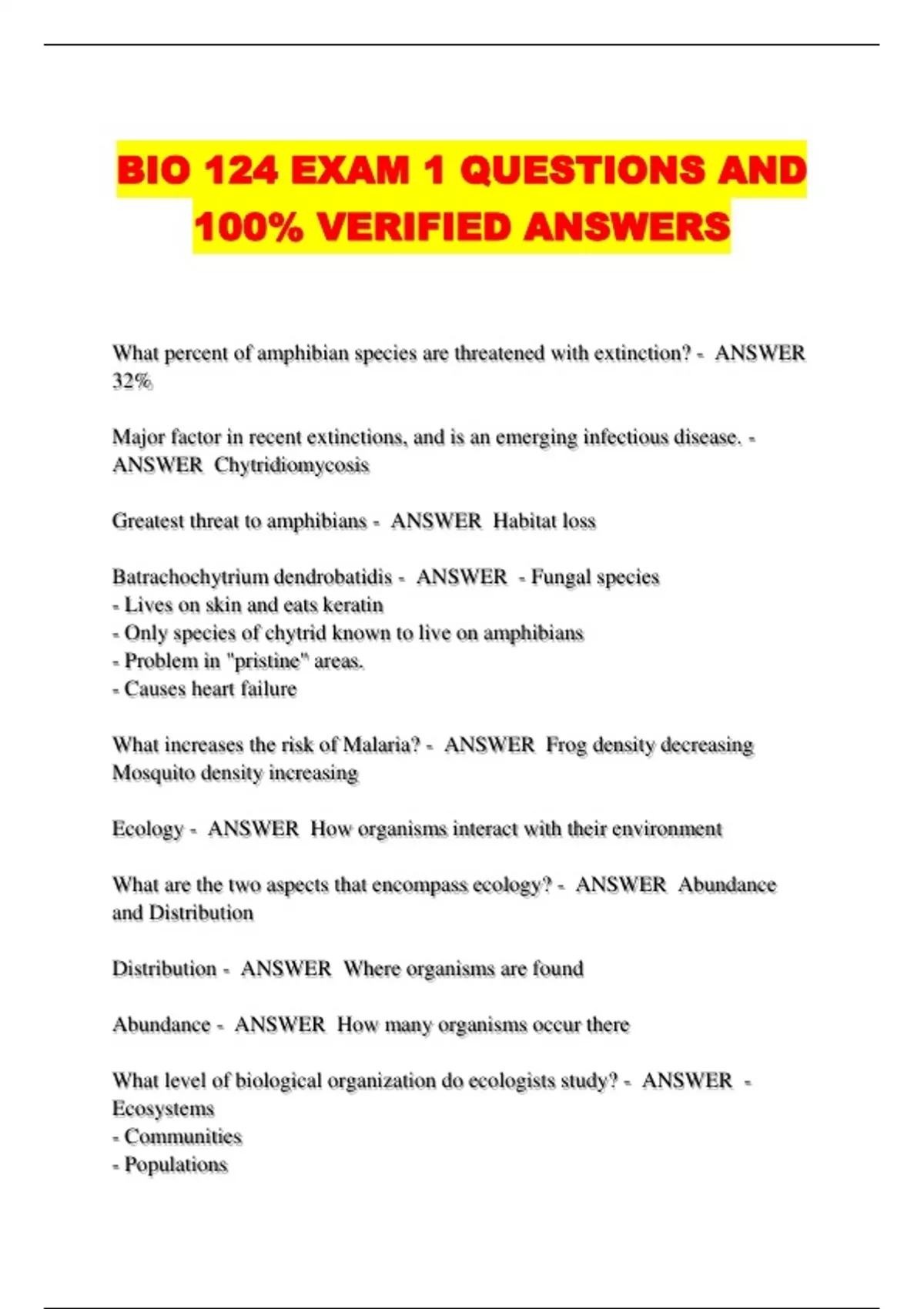 BIO 124 EXAM 1 REVIEW QUESTIONS AND ANSWERS